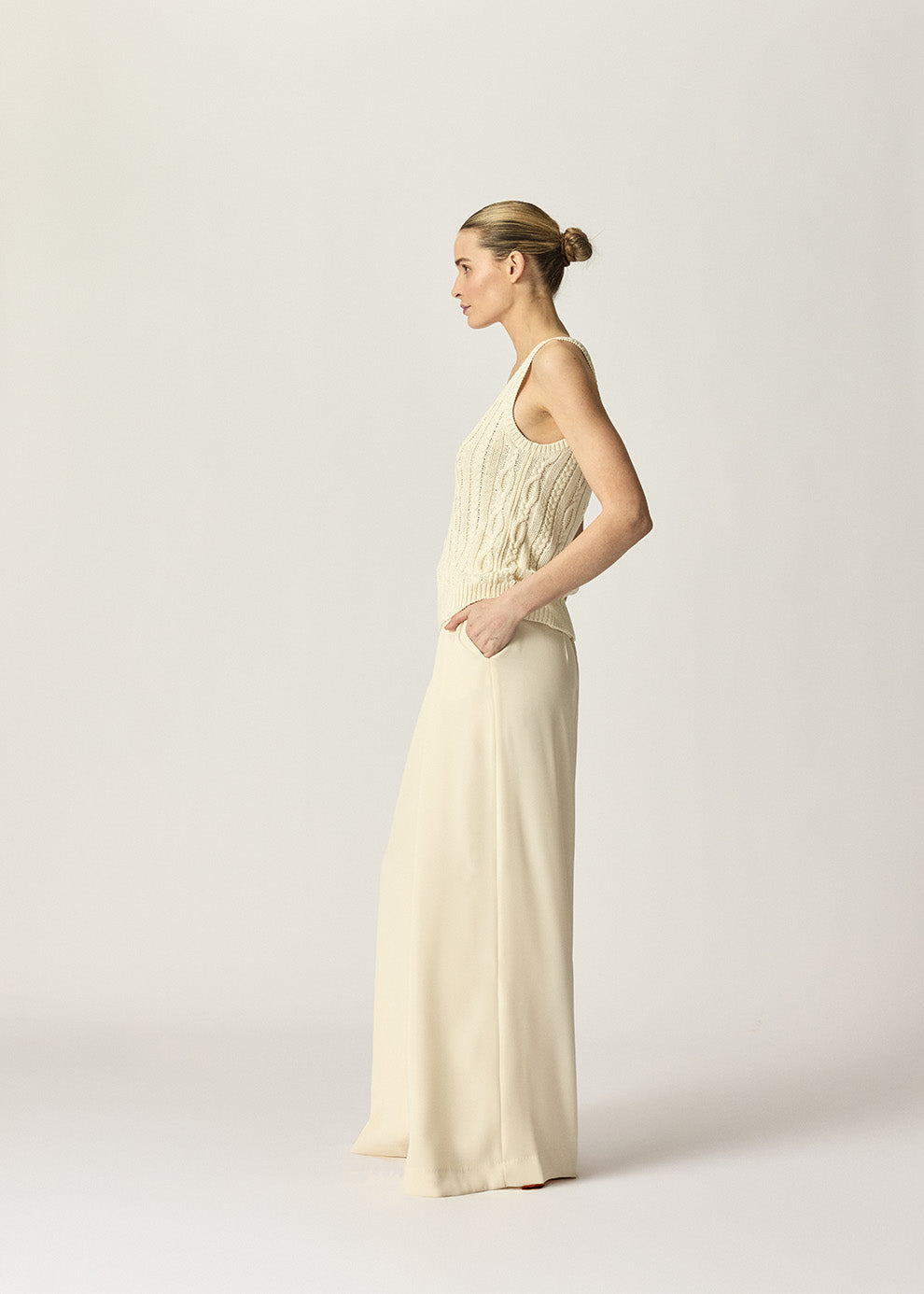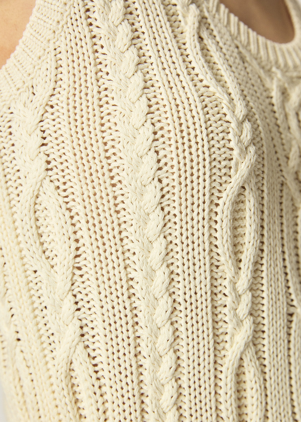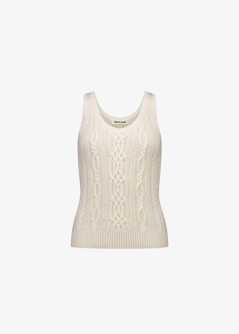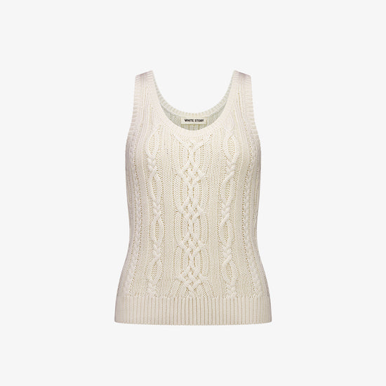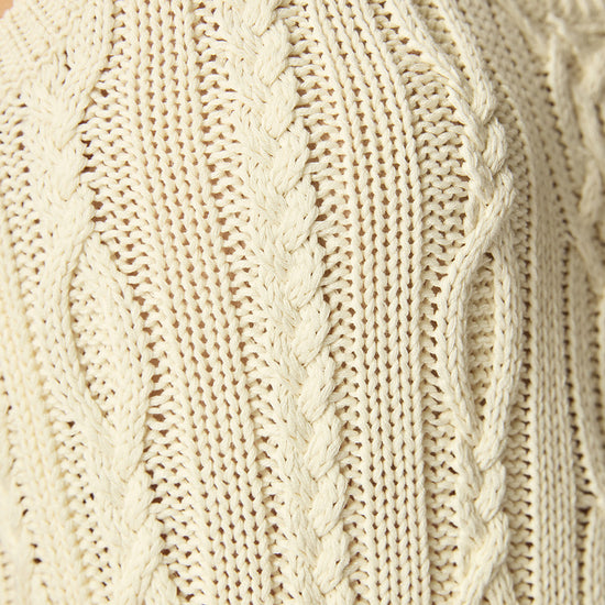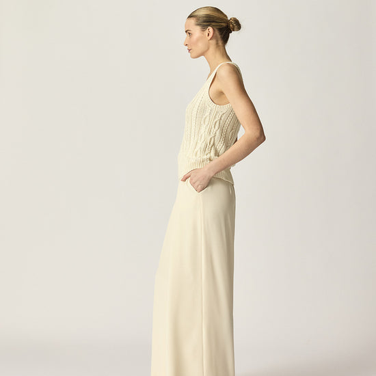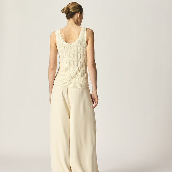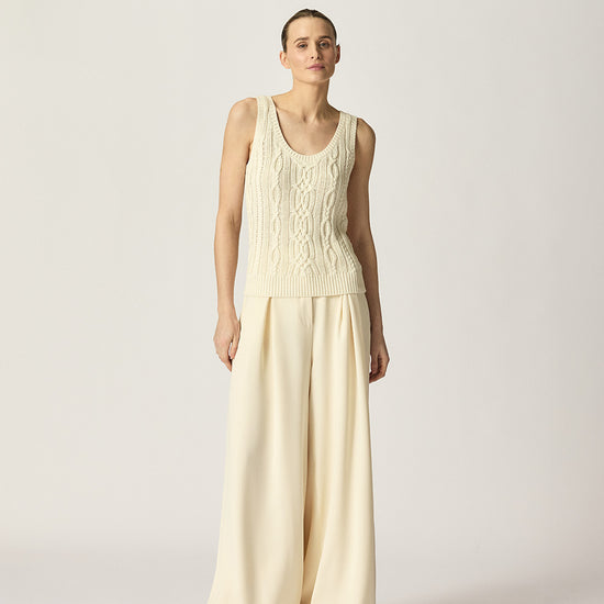 The Ariana Tank is crafted in a luxe cotton-silk blend with a heavy cable knit texture. Featuring wide straps, a scoop neckline, and a ribbed hem, it offers a refined take on everyday layering.