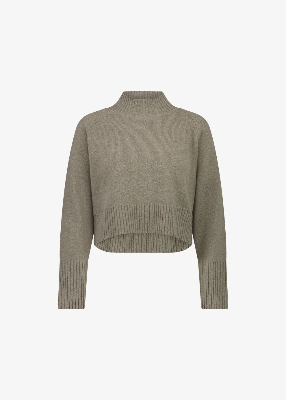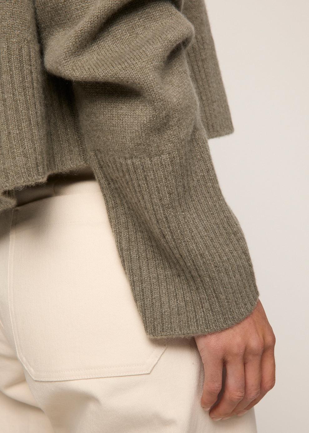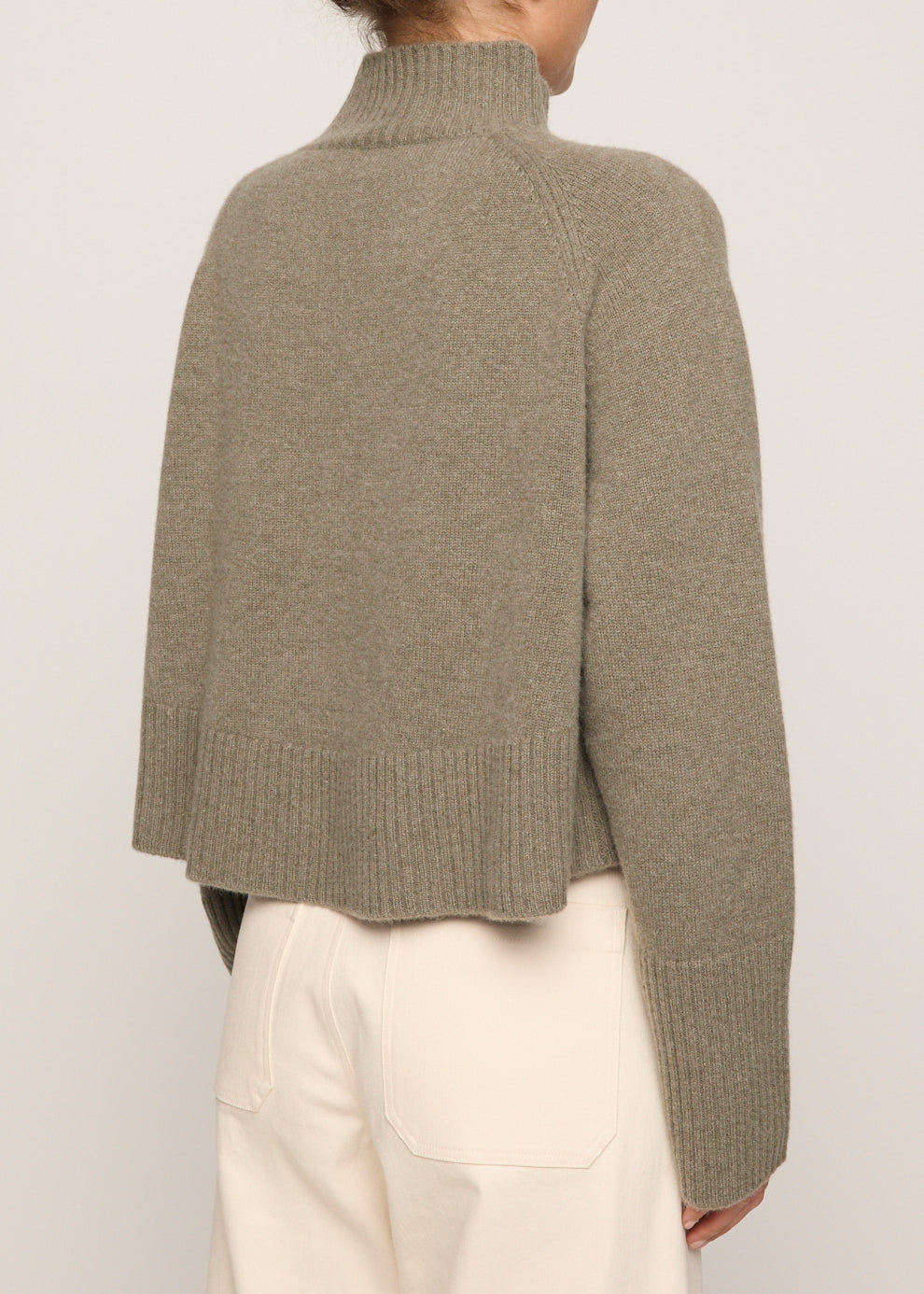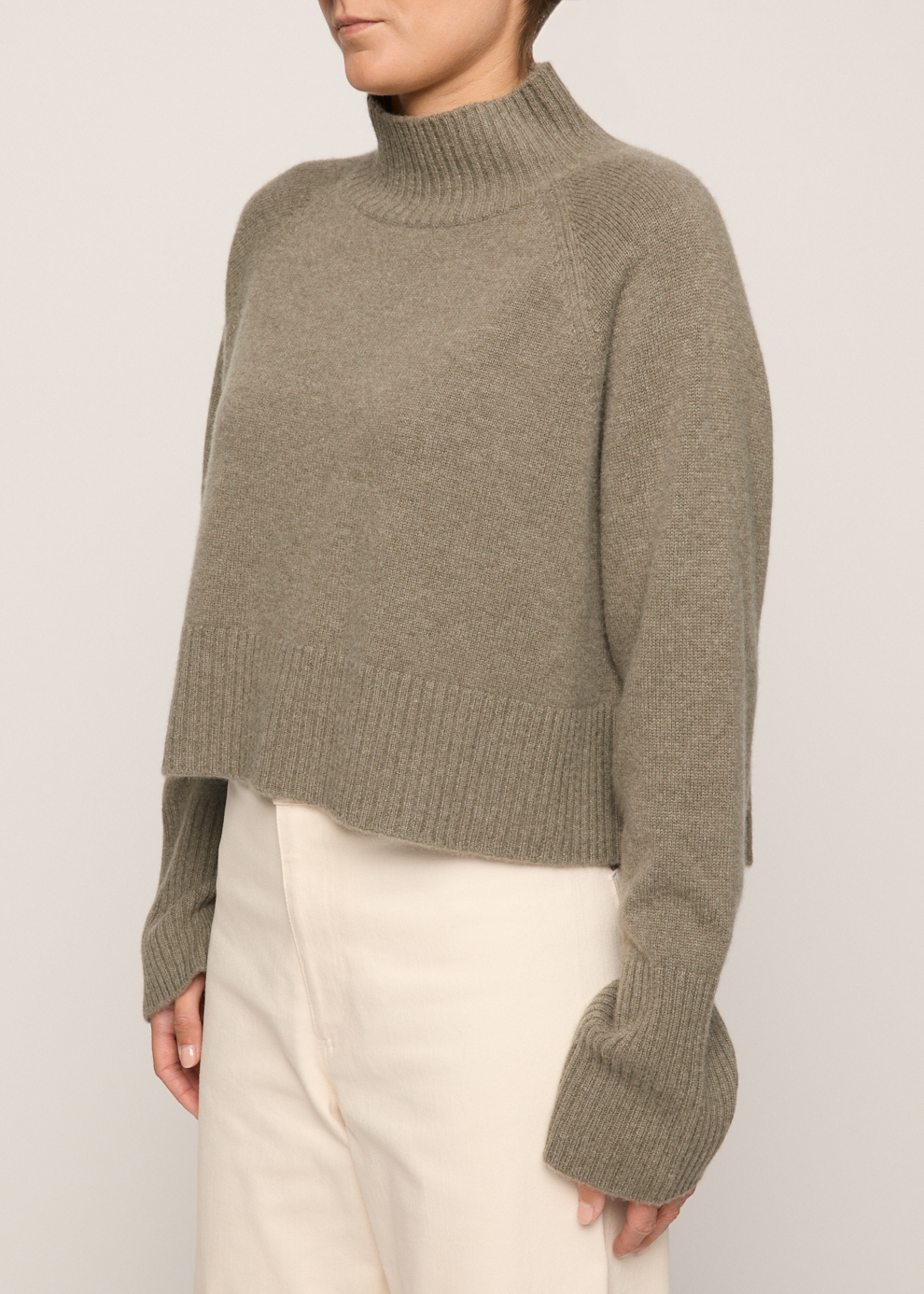 The Asha is crafted from our signature 100% cashmere in a cropped, oversized fit. Designed to sit off the body, it features a high neckline, raglan sleeves, and wide ribbed cuffs, making it a versatile, seasonless layer.