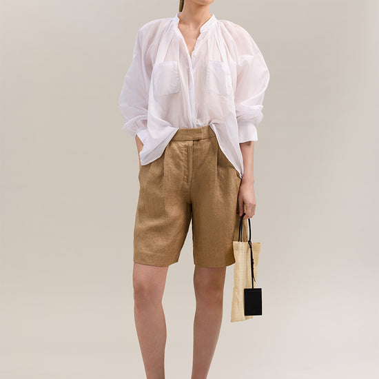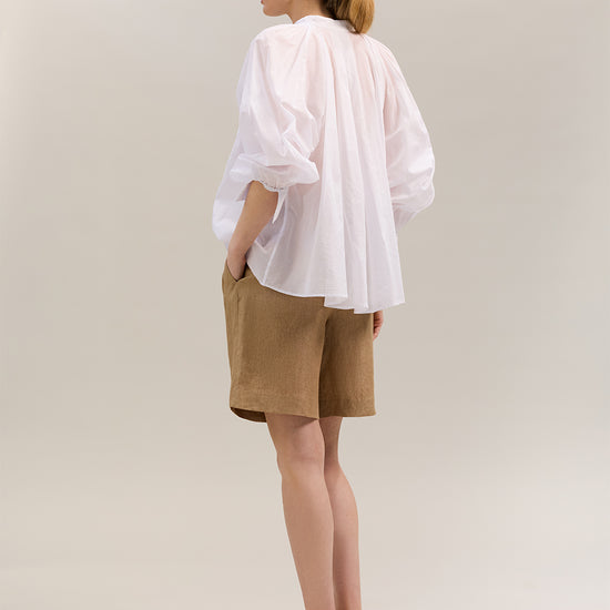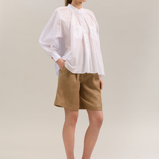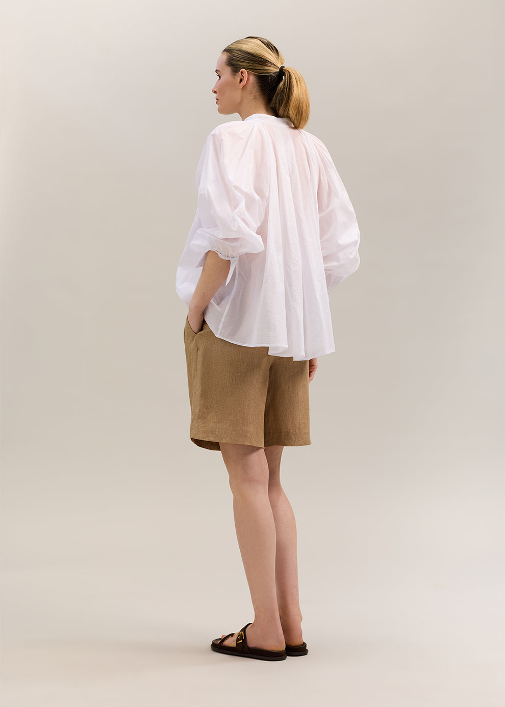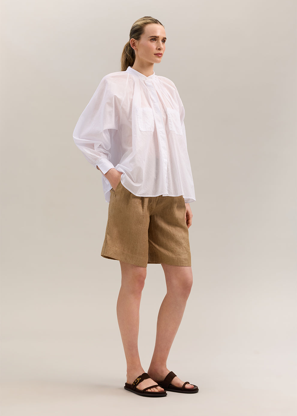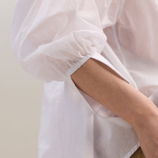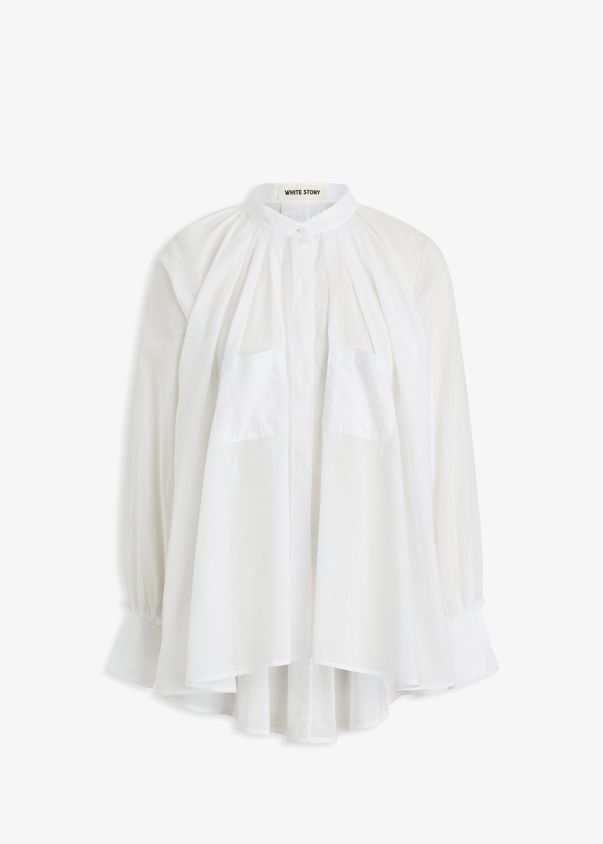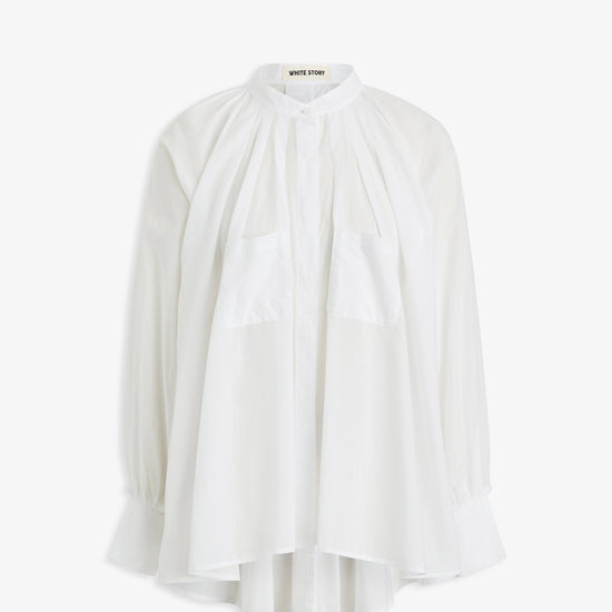 The Athena Shirt is crafted from lightweight cotton voile, blending structure with softness. Featuring a mandarin collar, pleated neckline, concealed button front, and elasticated cuffs, it offers a sheer, relaxed silhouette with refined detail.