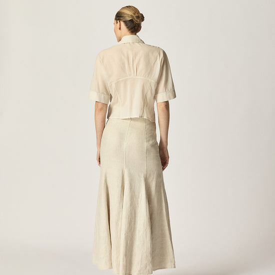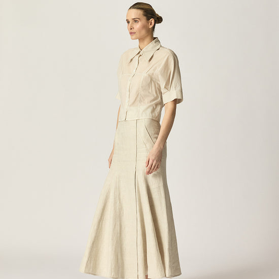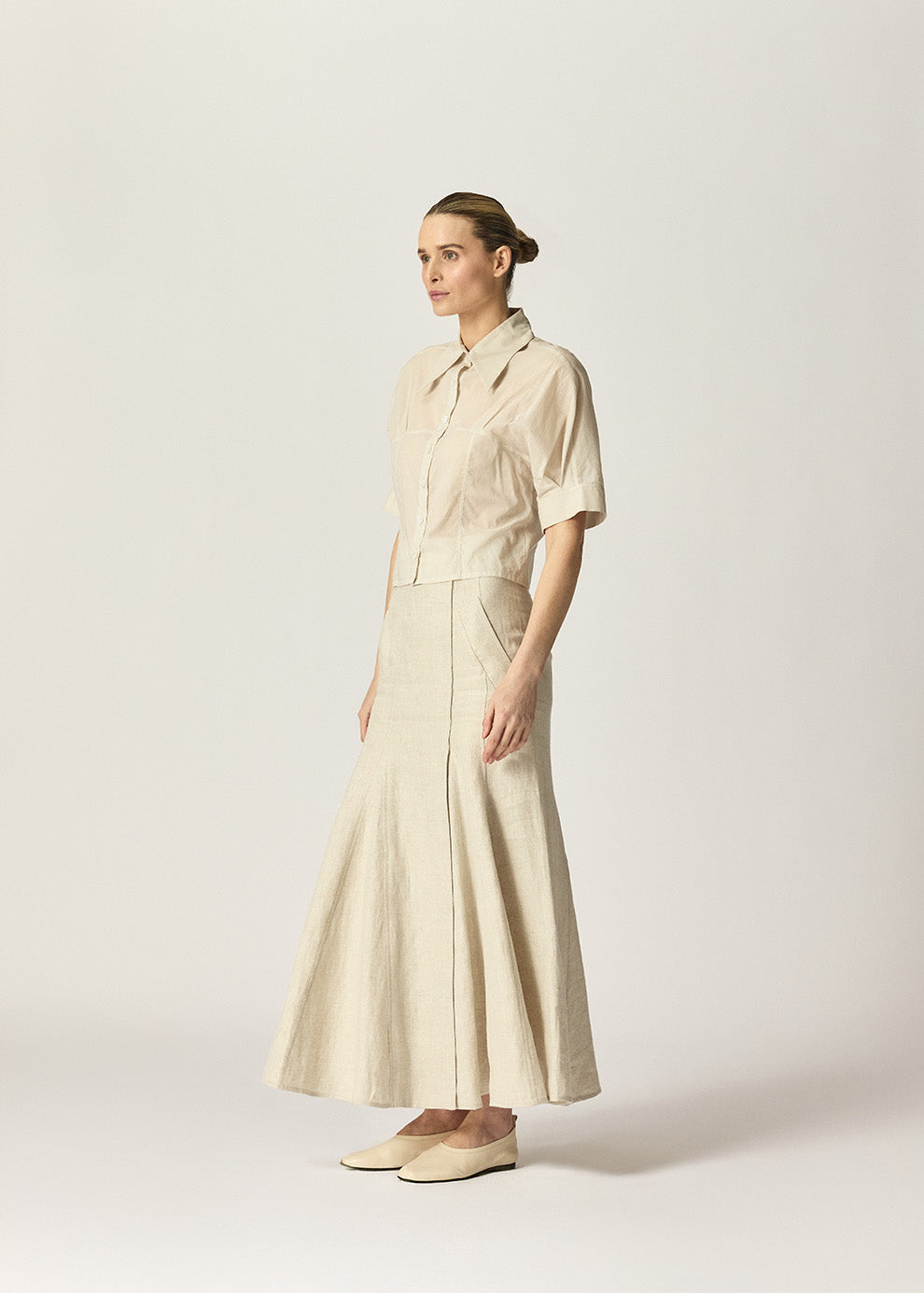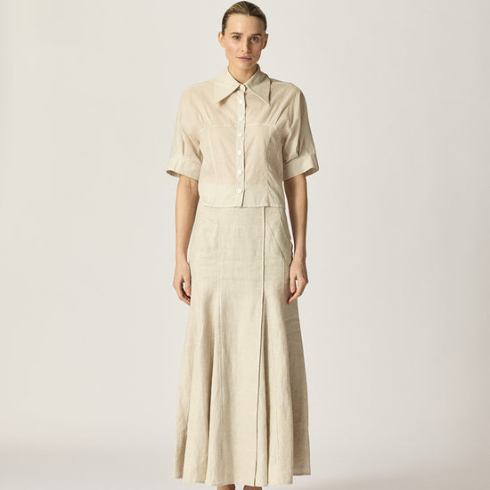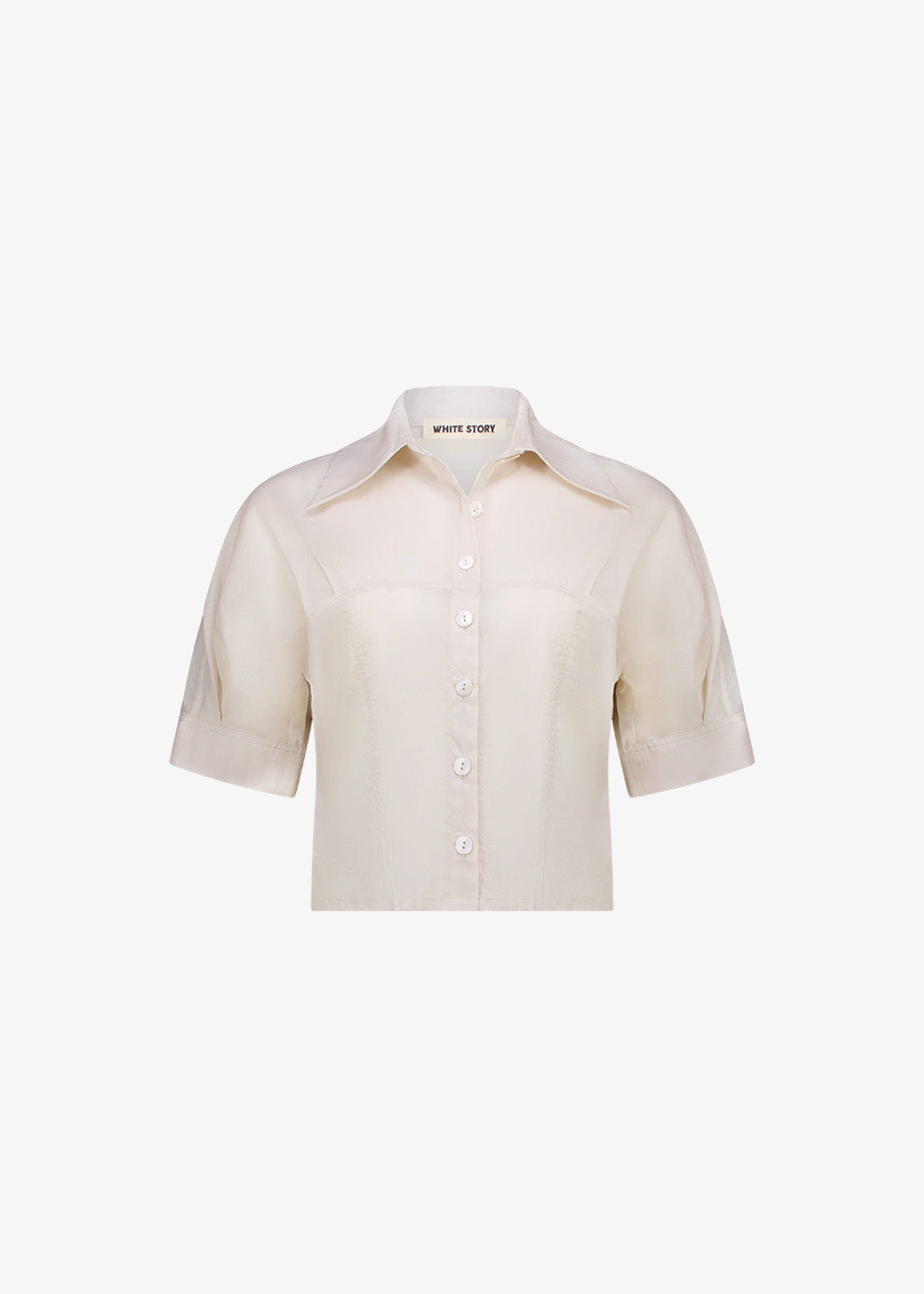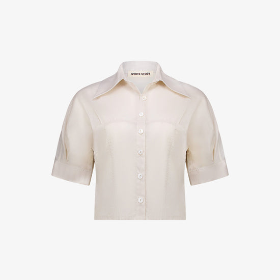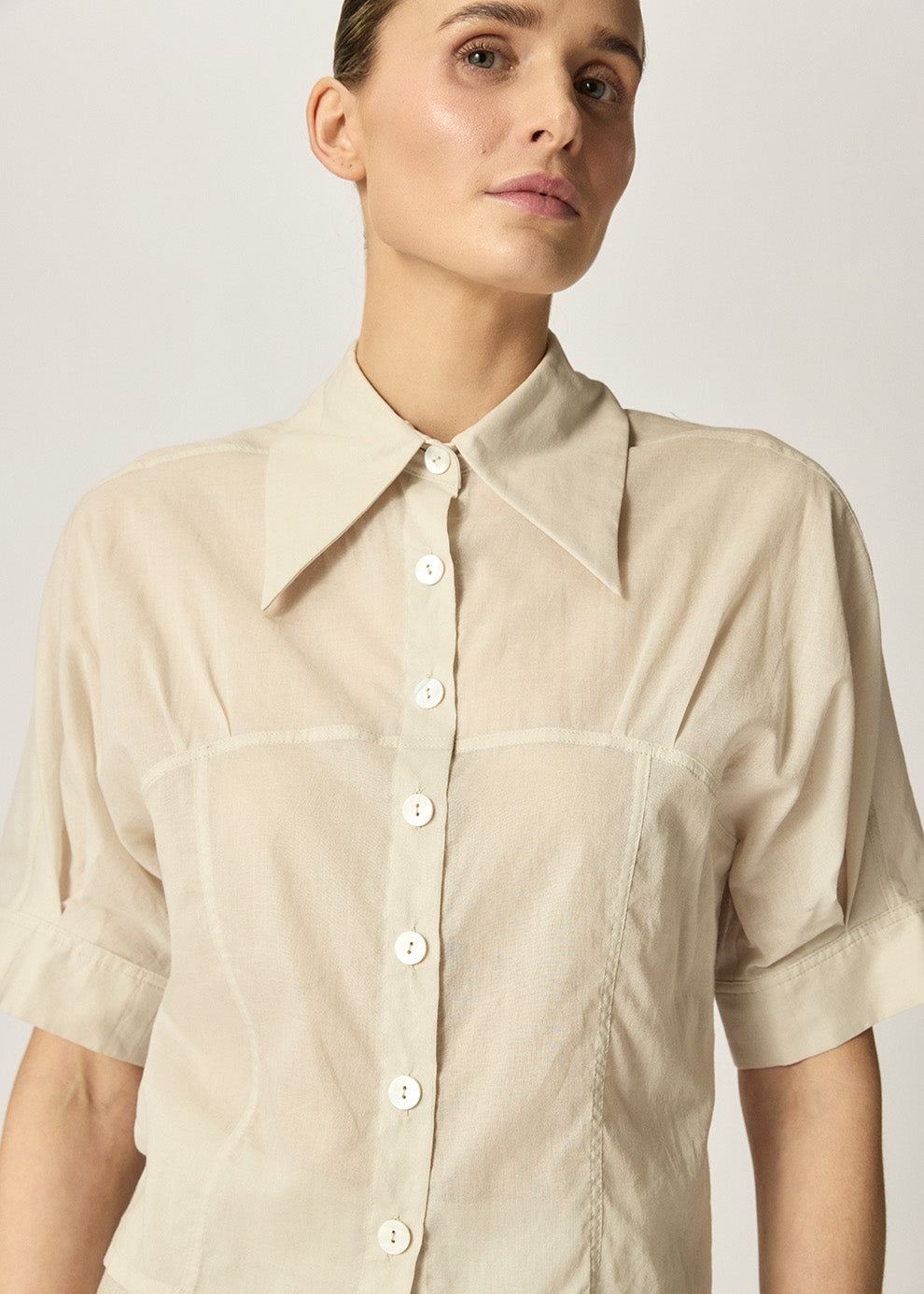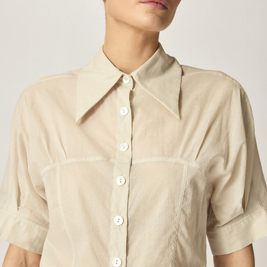 The Avita Shirt is crafted from sheer Japanese cotton lawn, featuring a pointed collar and delicate pleats at the bust. Inspired by an archival silhouette, it blends feminine sophistication with modern ease.