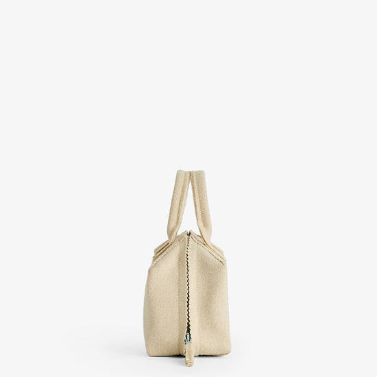 Made from traditional Portuguese burel wool, the Micro design offers a soft yet structured feel with natural durability. Designed to fully flatten, it’s lightweight and practical for everyday use or travel. Finished with an exposed fabric zip pull and presented in Pearl, a light, neutral tone shared with Burel.