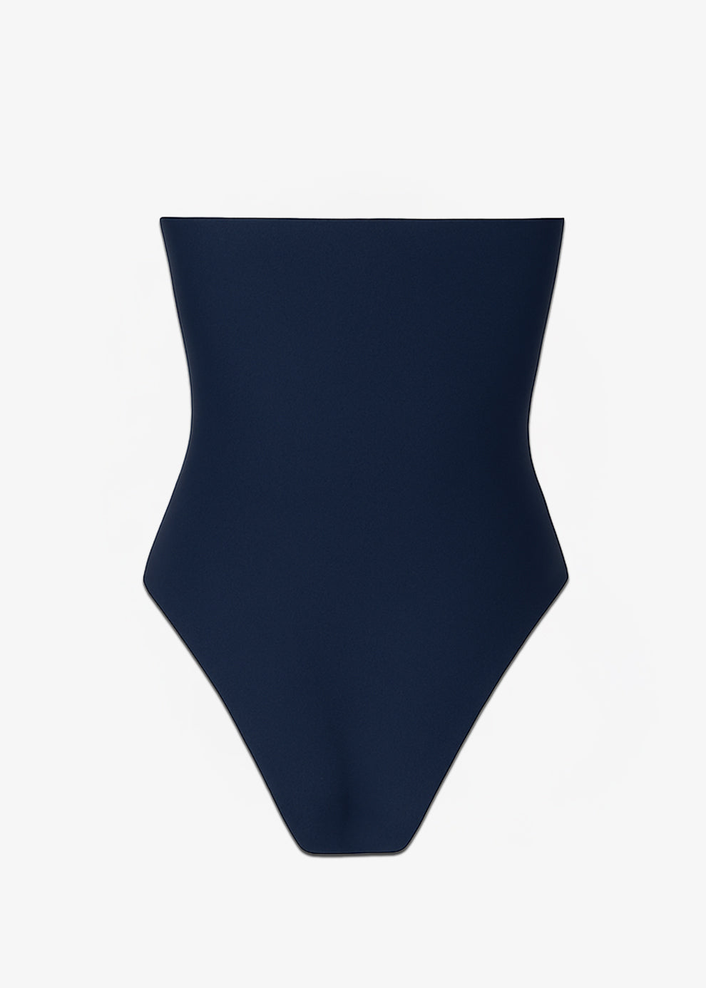 The piece is double self lined for perfect contouring, features a hidden elasticised shelf bra, elongated leg line and medium brief coverage.