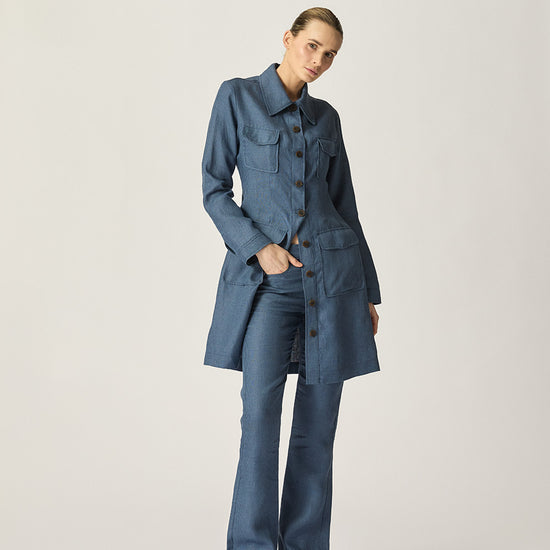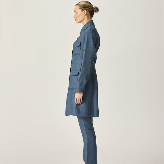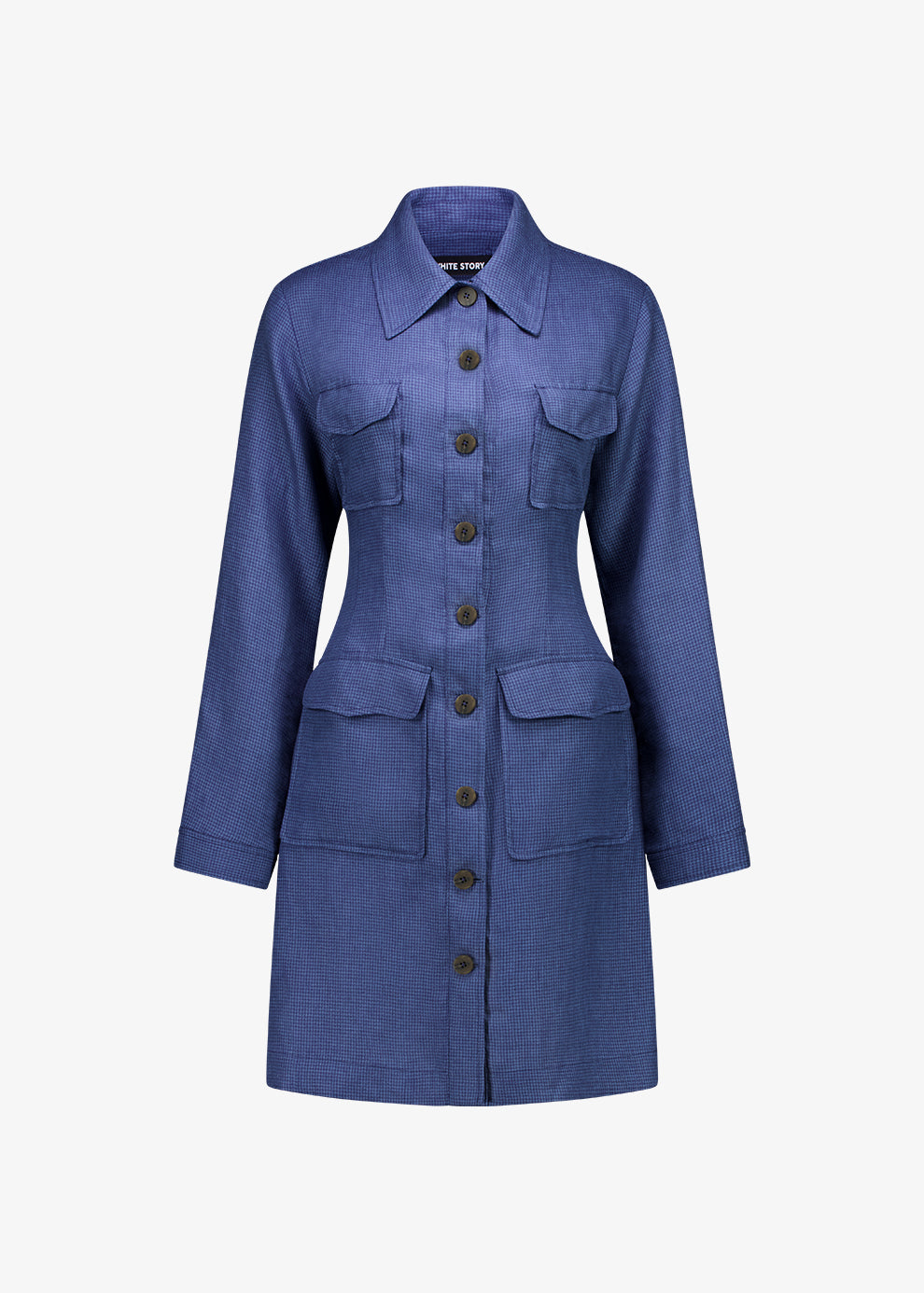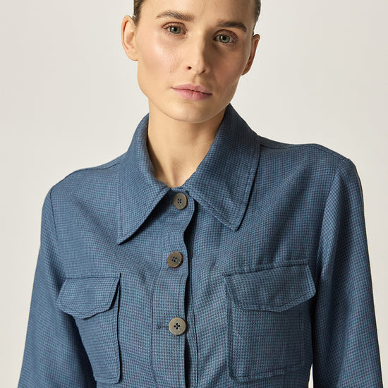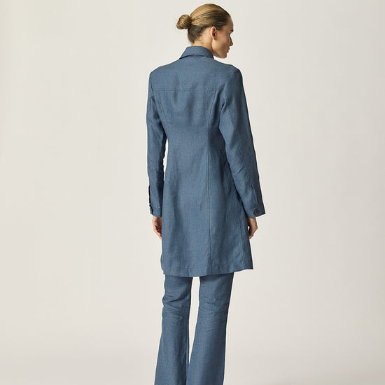 The Cairo Dress is a sharp, tailored jacket dress cut from premium Portuguese linen in a bold blue houndstooth. Featuring patch pockets, full-length sleeves, and a centre front button closure, it’s finished with a structured midi-length silhouette.