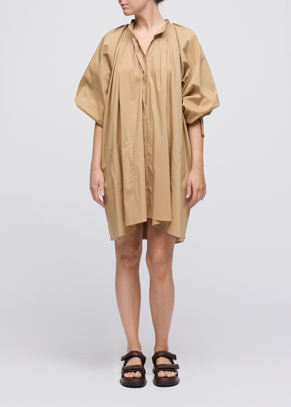 This relaxed dress will be the perfect summer throw on for hot days and warm nights. Crafted from lightweight, breathable 100% cotton, this dress offers a loose, comfortable fit that flows beautifully with every step. Featuring a front placket opening, pleating that falls from the shoulder and from the cuff, and front patch pockets.