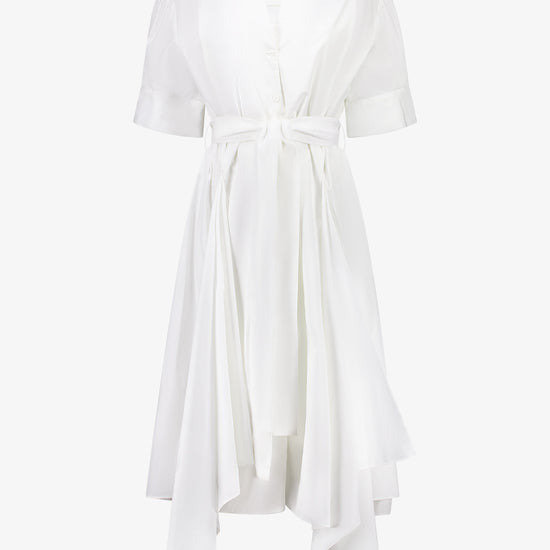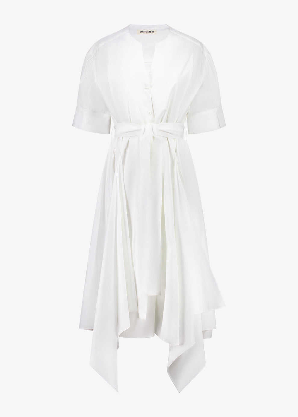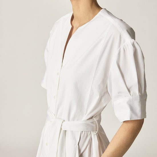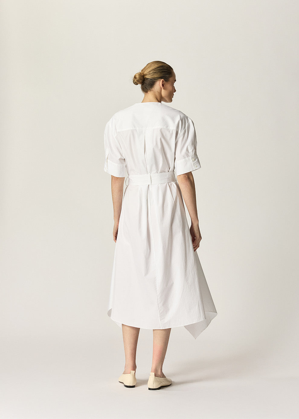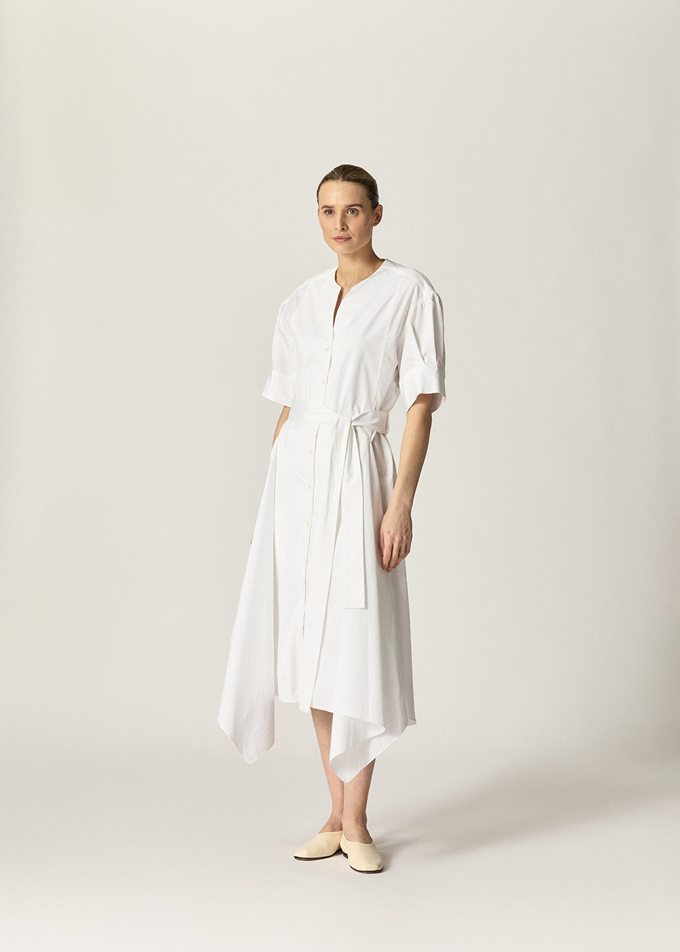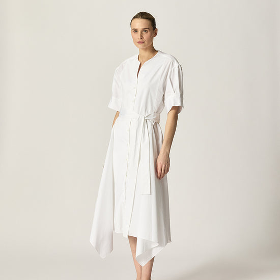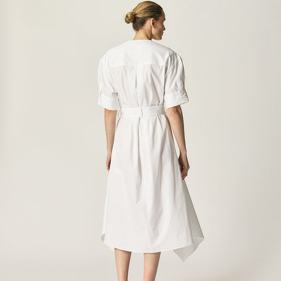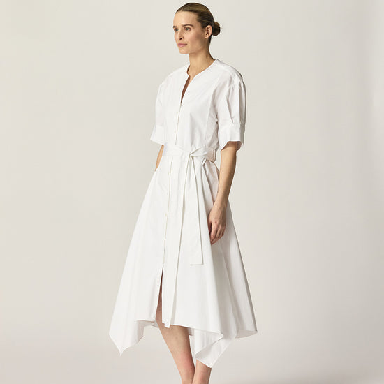 The Catalina Dress is a modern hanky hem style crafted from premium Portuguese cotton. Featuring a V-neckline, short puffed sleeves, in-seam pockets, and a waist tie, it offers a flattering, feminine fit with effortless movement.