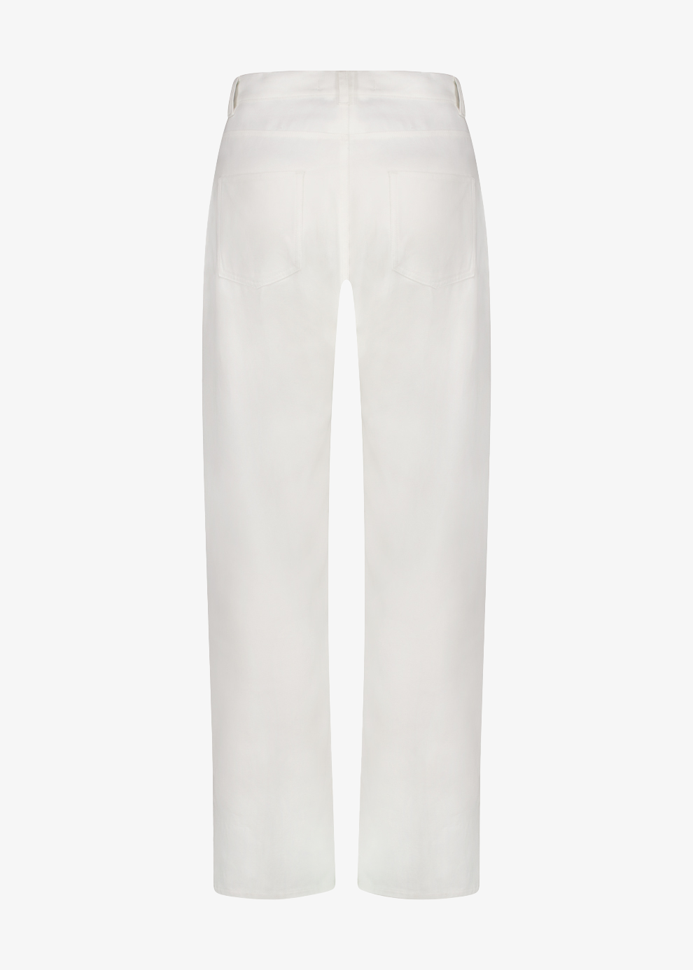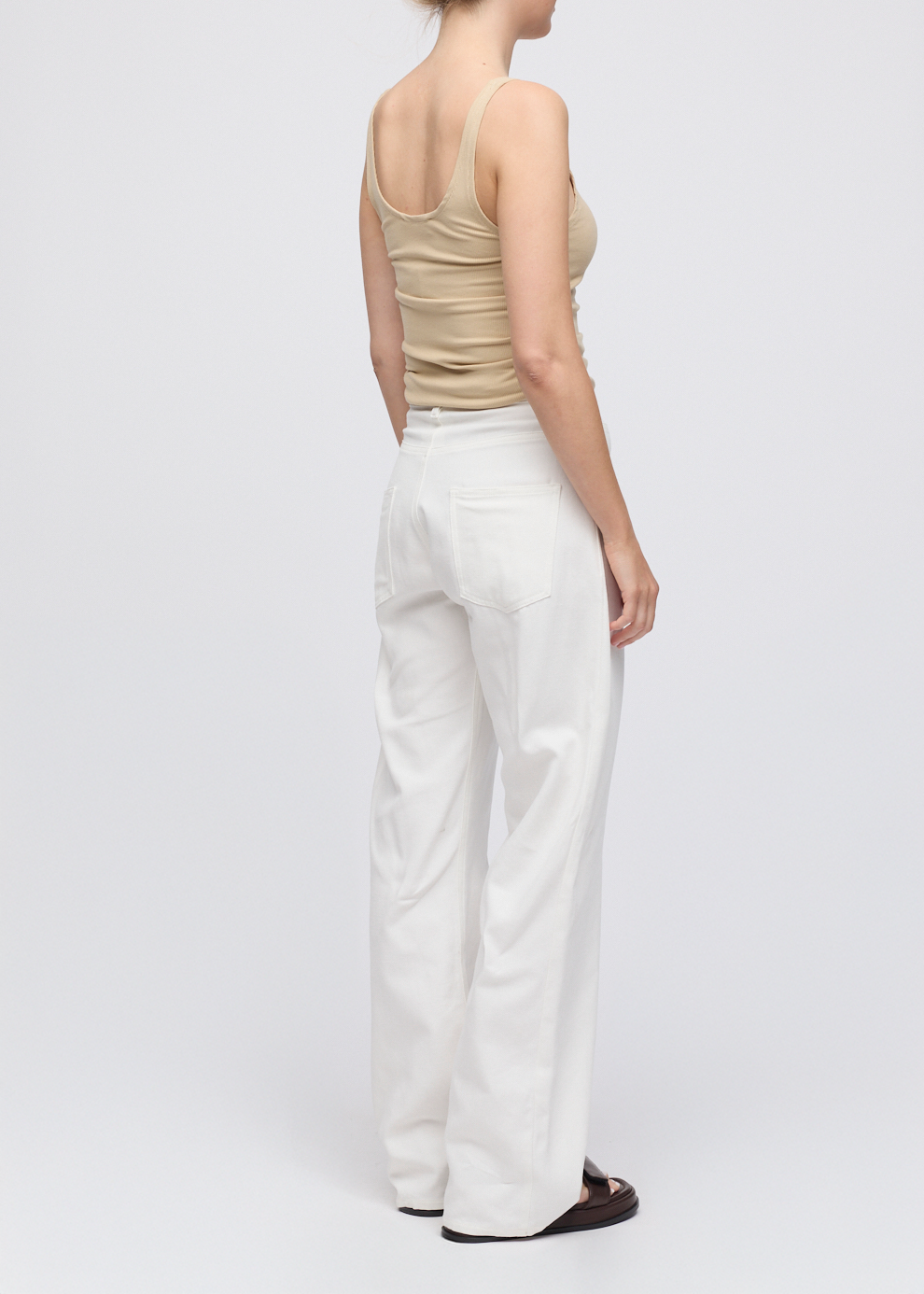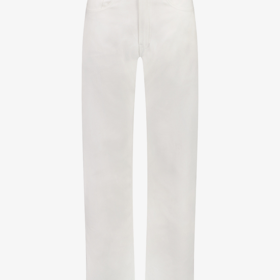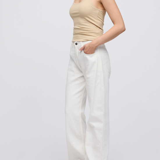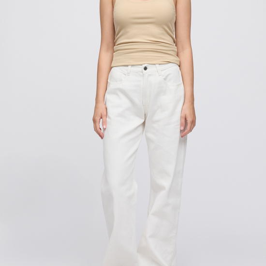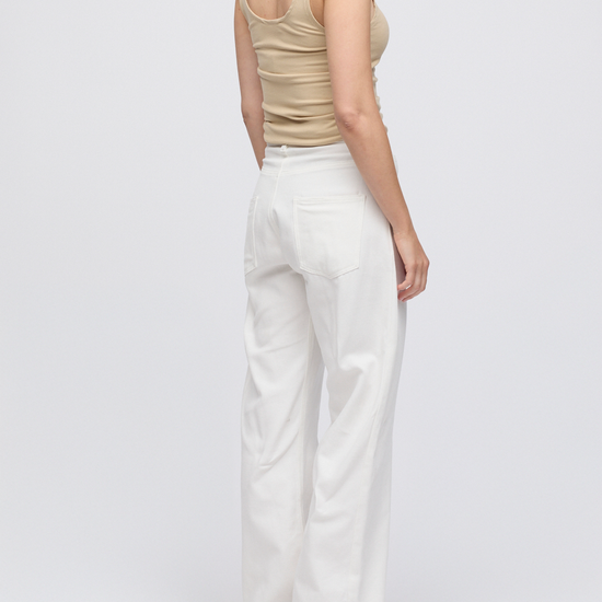 Based on a piece from our Creative Director's own wardrobe, and reimagined for White Story, this white denim jean features a straight legged silhouette for effortless everyday dressing. Designed with a mid rise, this style fits snug around the waist. Pair with a Hana Tee for a capsule look that will take you through the seasons.
