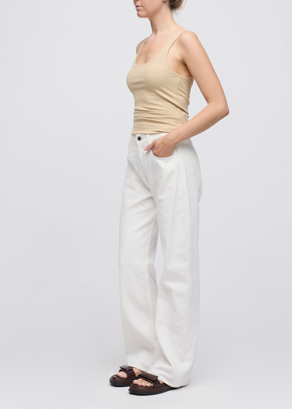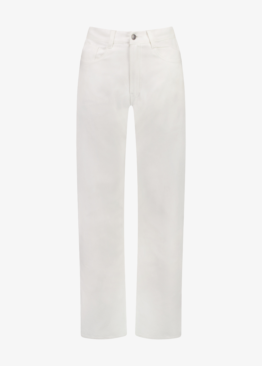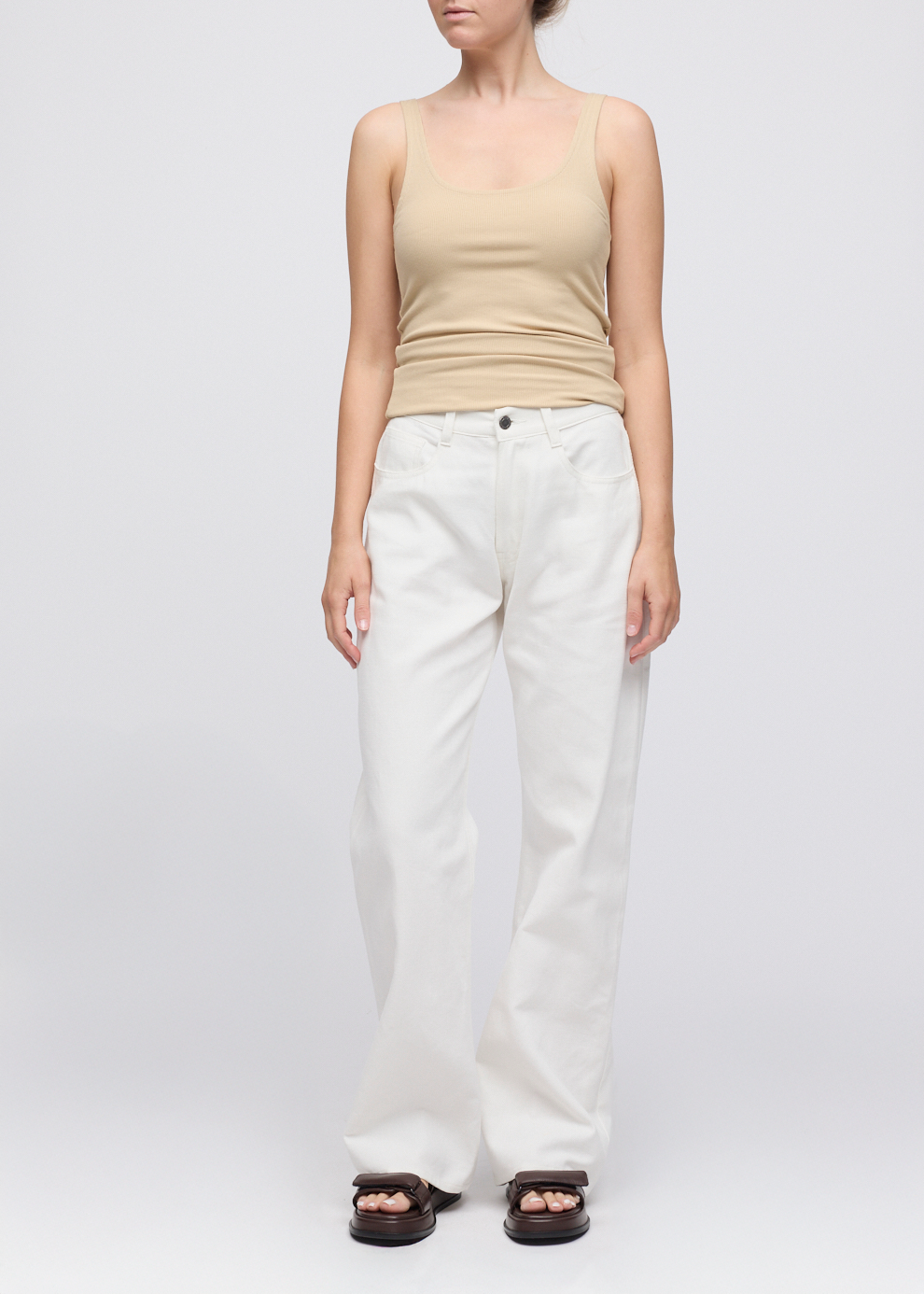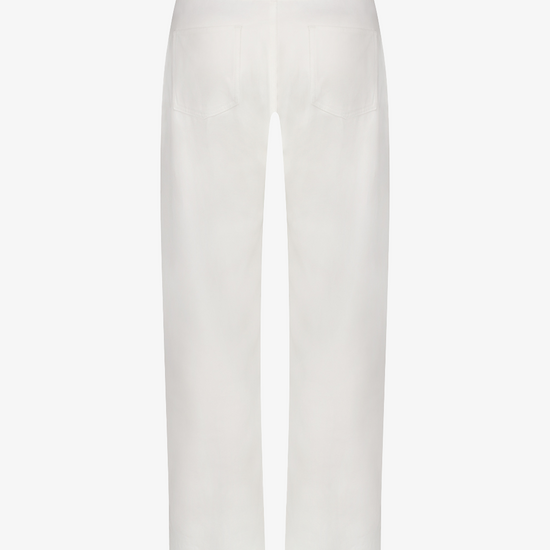 Based on a piece from our Creative Director's own wardrobe, and reimagined for White Story, this white denim jean features a straight legged silhouette for effortless everyday dressing. Designed with a mid rise, this style fits snug around the waist. Pair with a Hana Tee for a capsule look that will take you through the seasons.