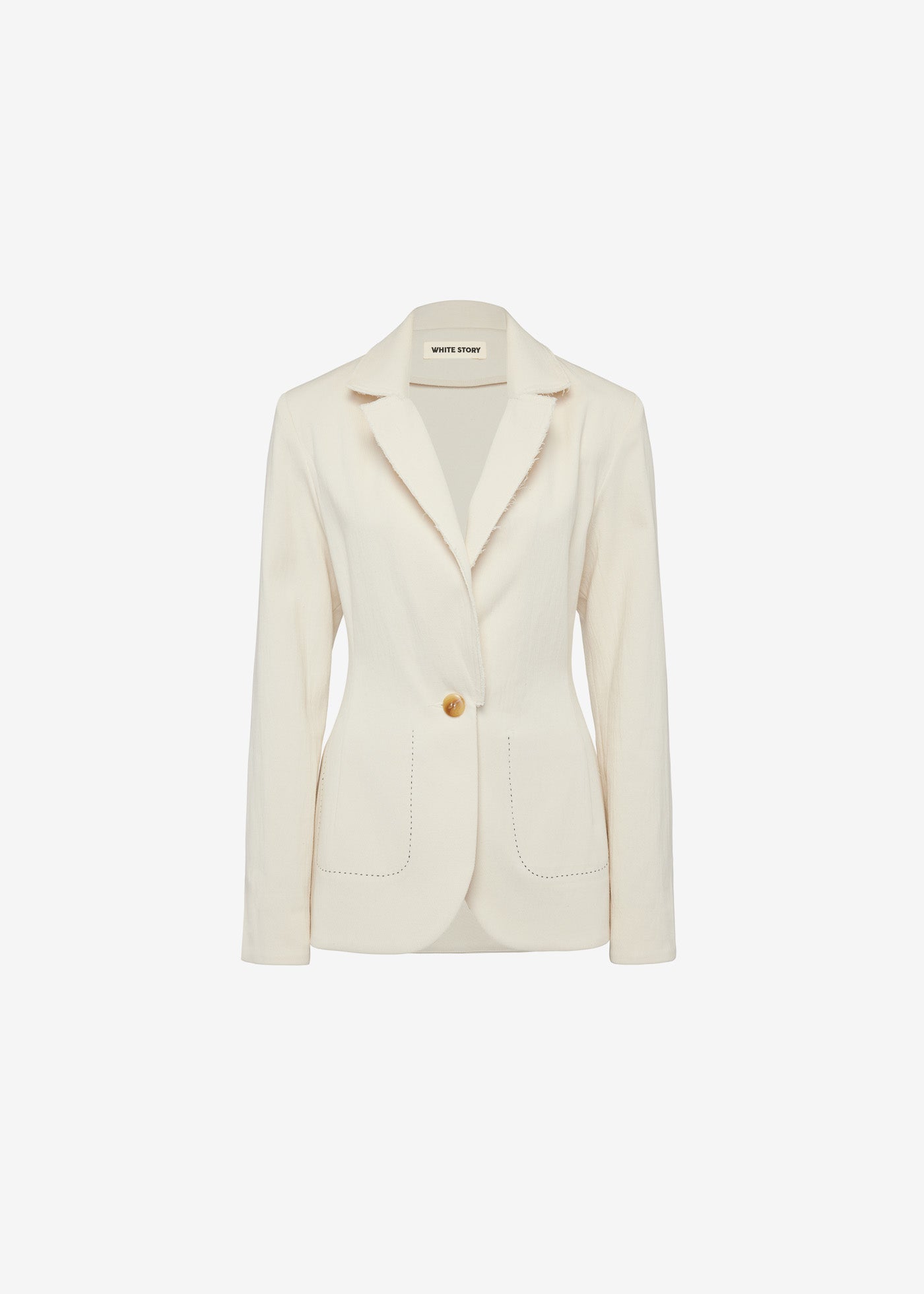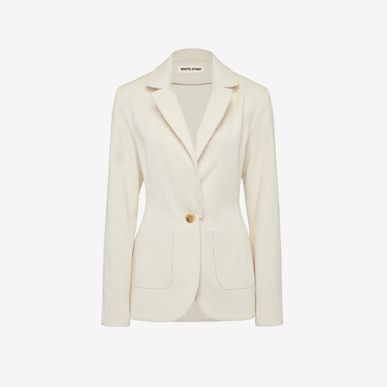 The Corso blazer is fabricated in an organic cotton denim fabric from Japan. This single breasted blazer with shaped waist features raw edges at the lapel, internal hip patch pockets with contrast outer topstitch in black, sleeve vents and two rear vents. Pair with the coordinating Corso Pant.