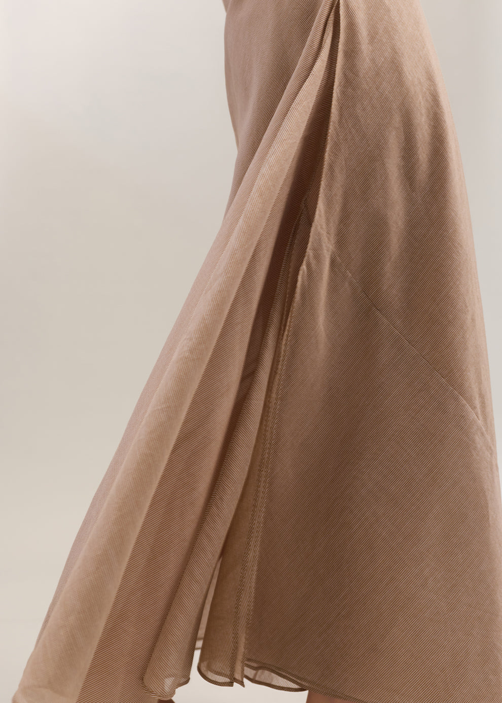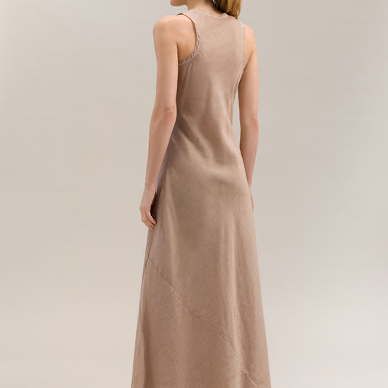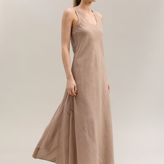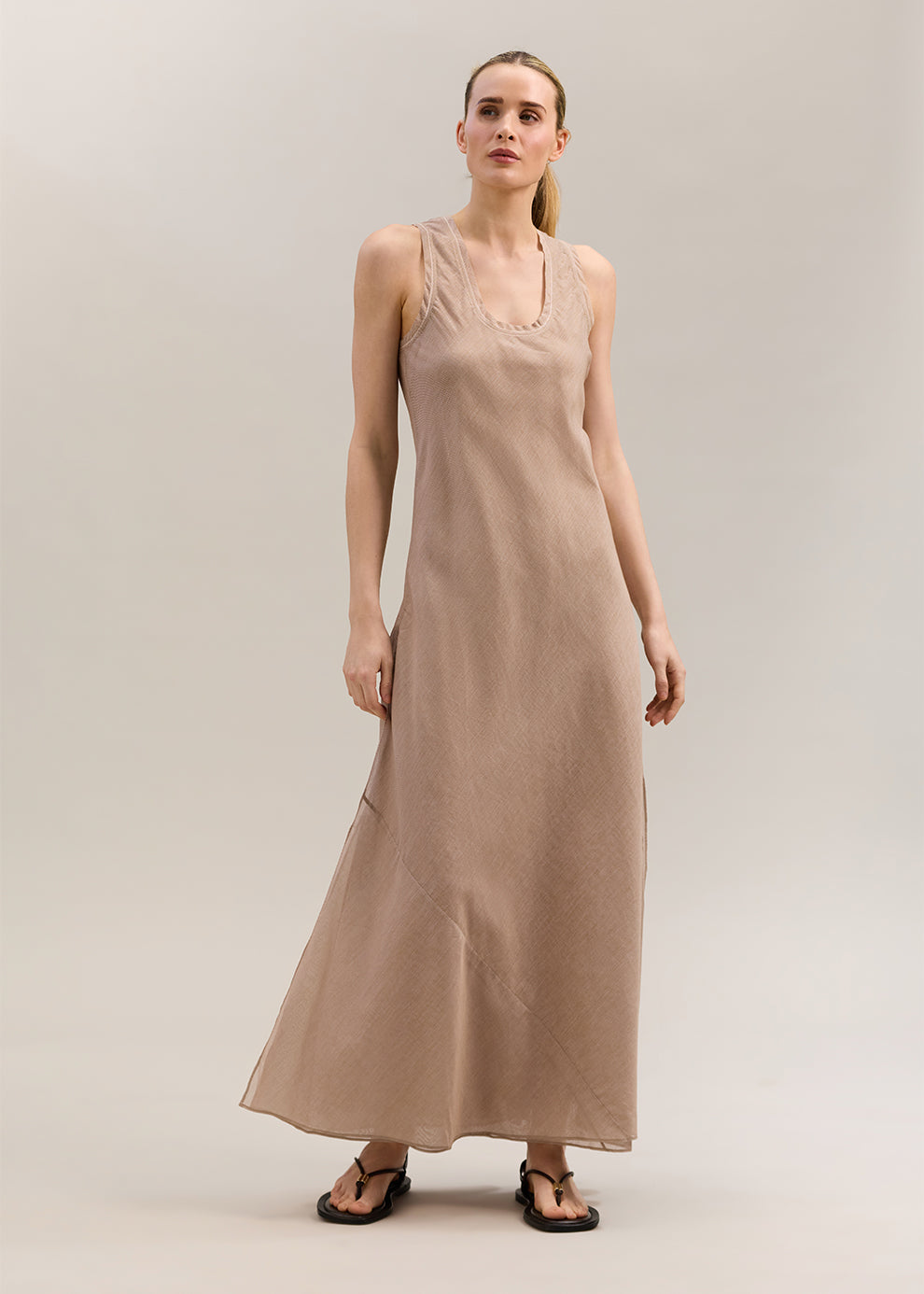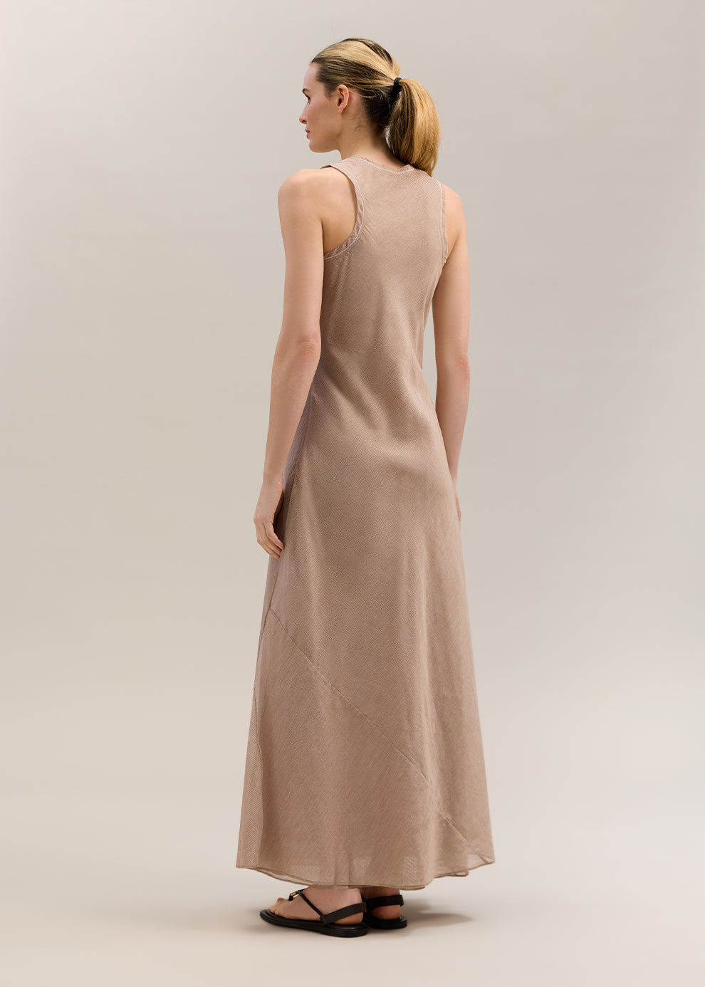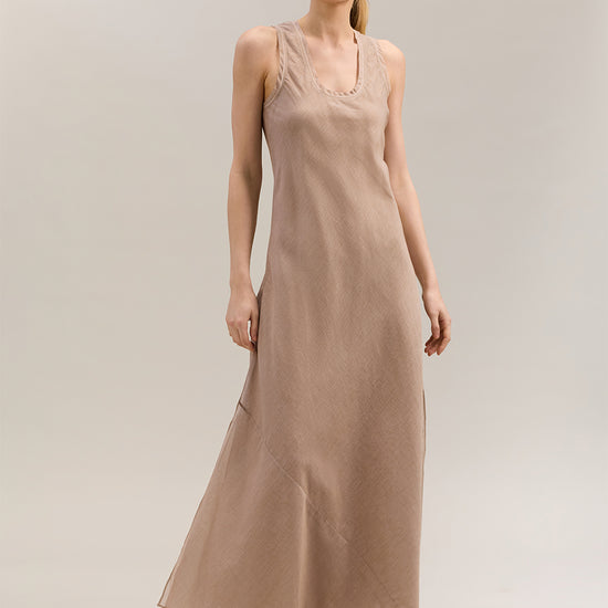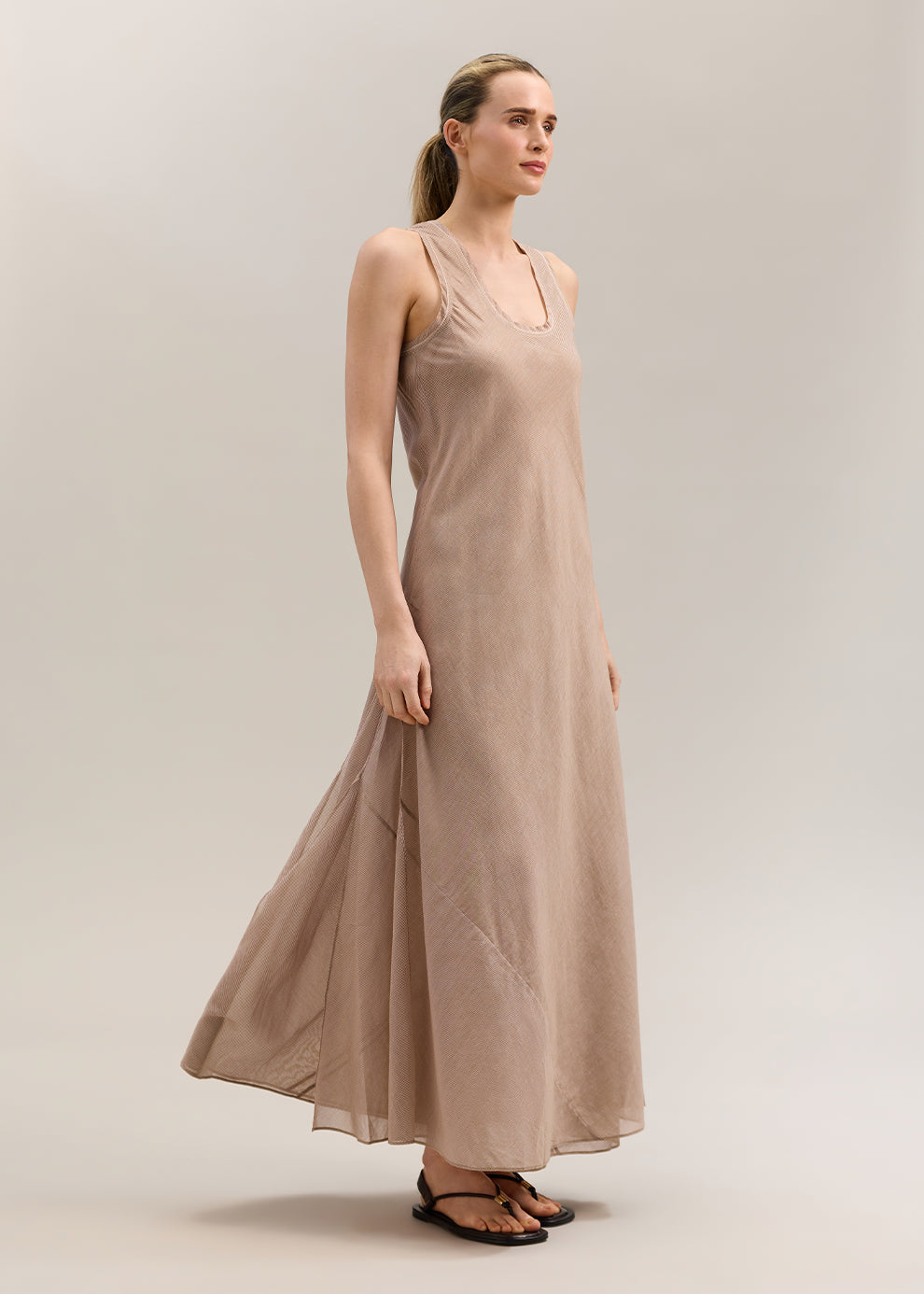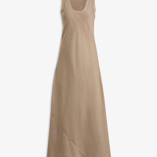 The Daphne Dress is a bias-cut maxi style crafted from a silk-cotton blend. Featuring a relaxed silhouette, scooped neckline with layered contrast binding, and side seam splits, it’s the perfect piece for your next summer escape.