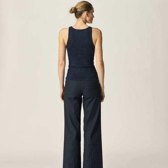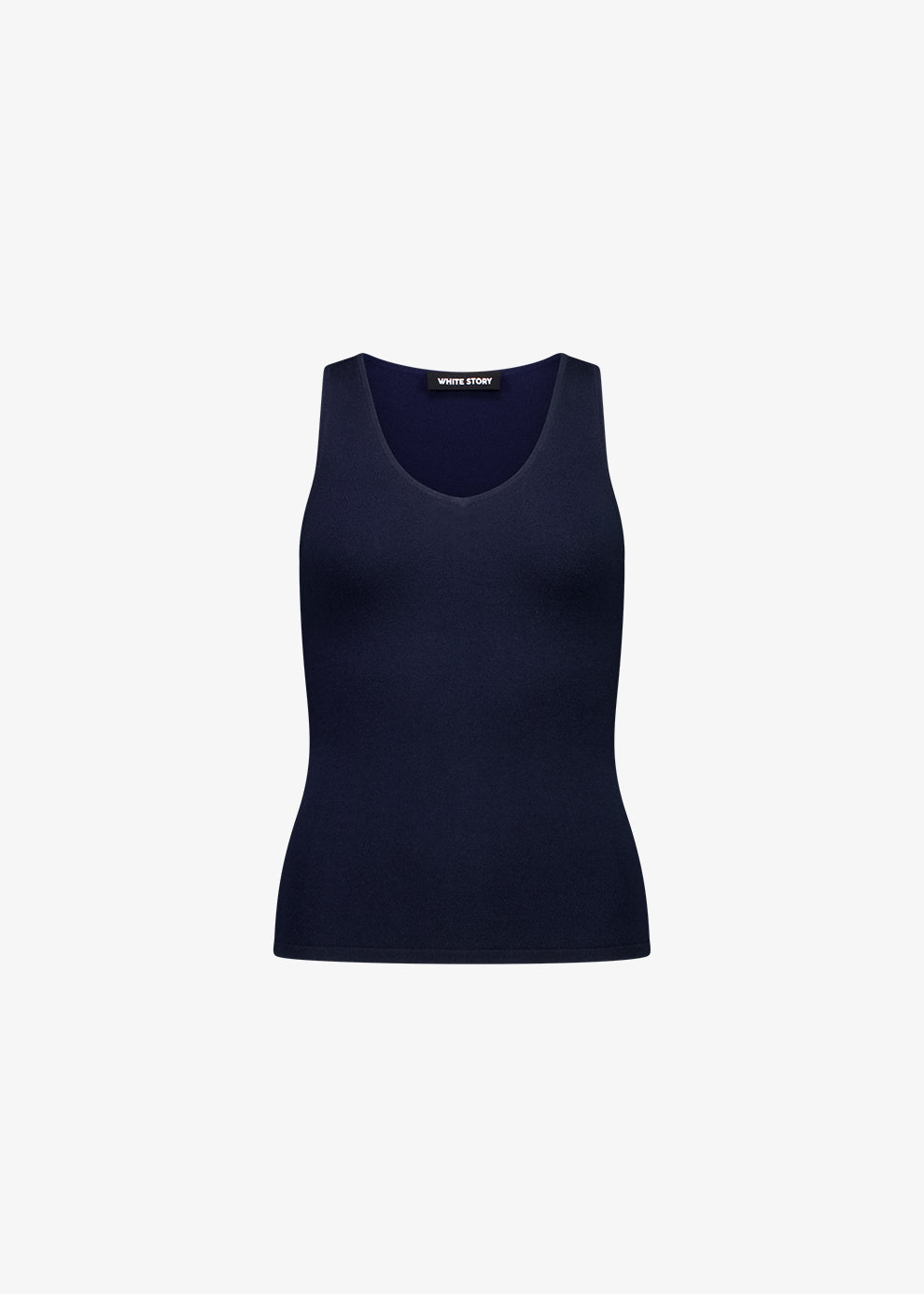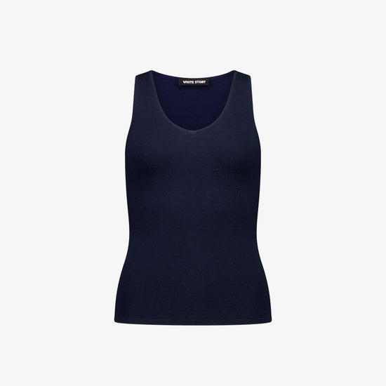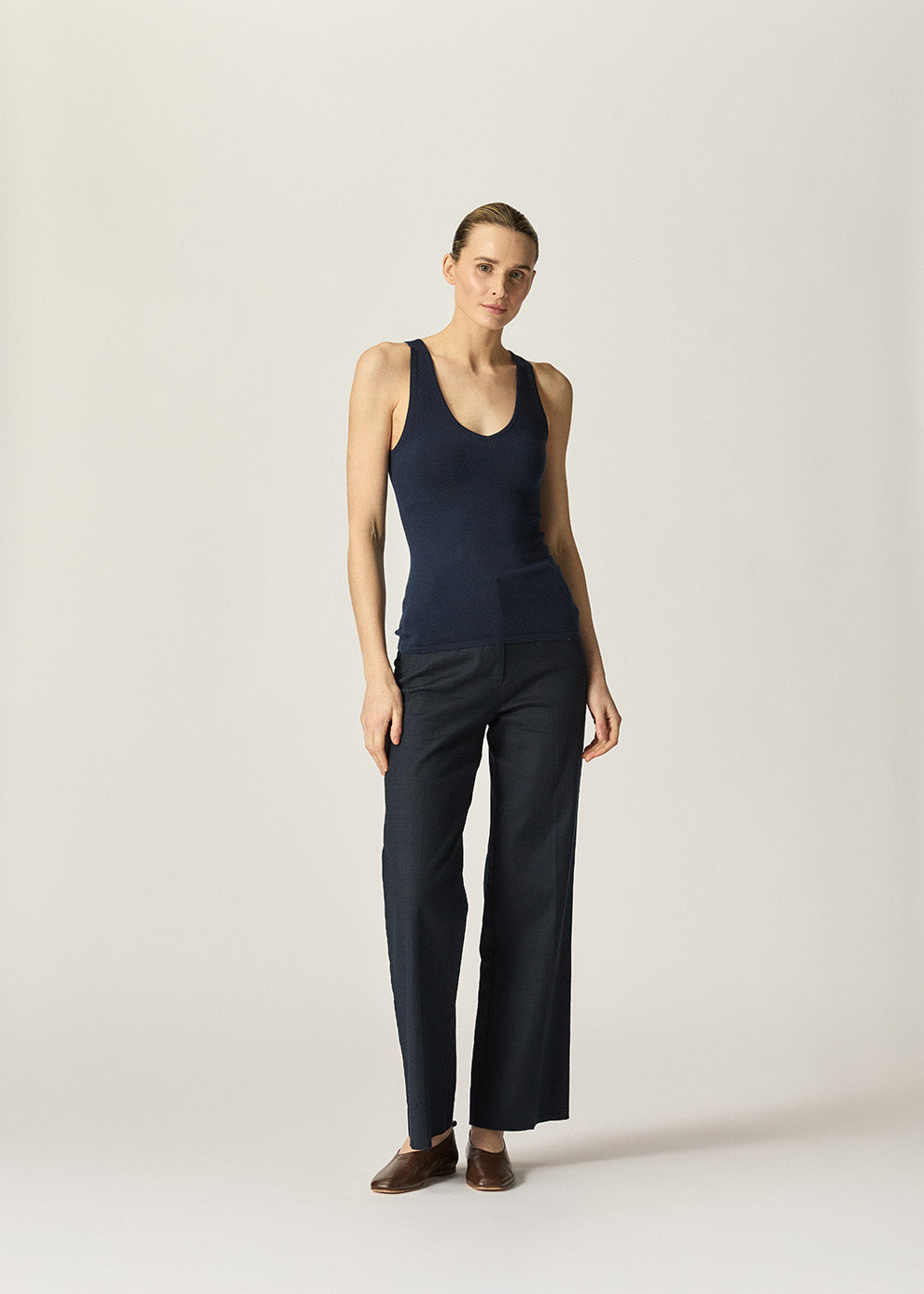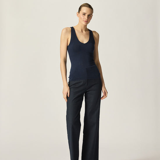 The Eleana Tank is a slim-fitting V-neck style crafted from a soft silk-cashmere blend. Finished with ribbed detailing at the neck and hem, it’s a refined layering piece for effortless Spring dressing.