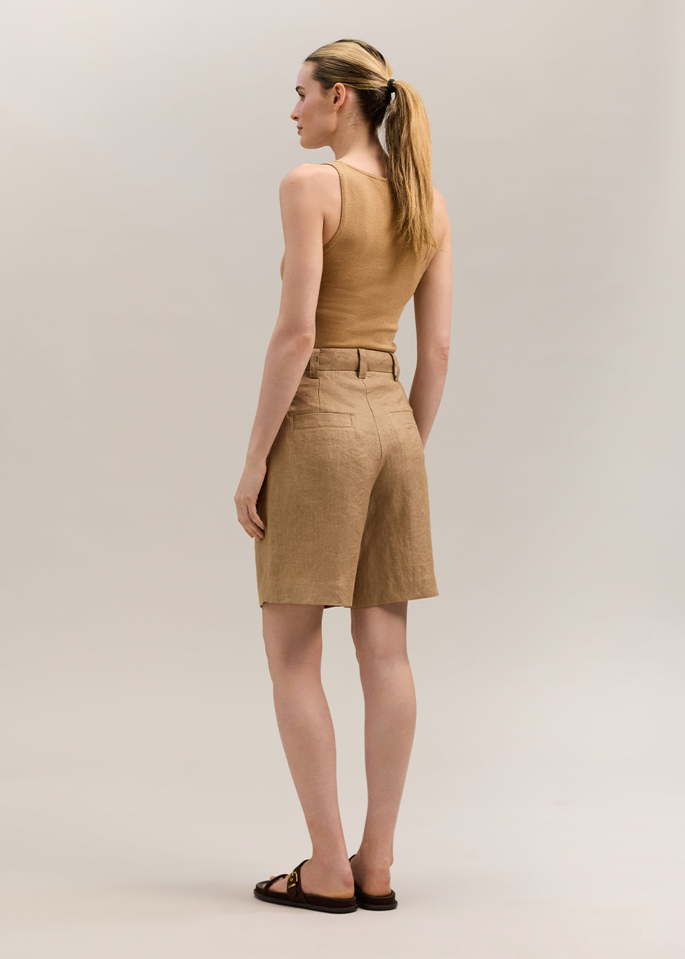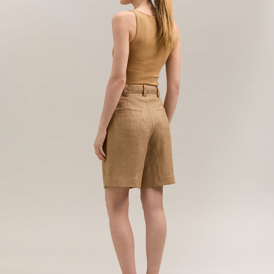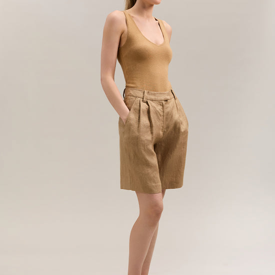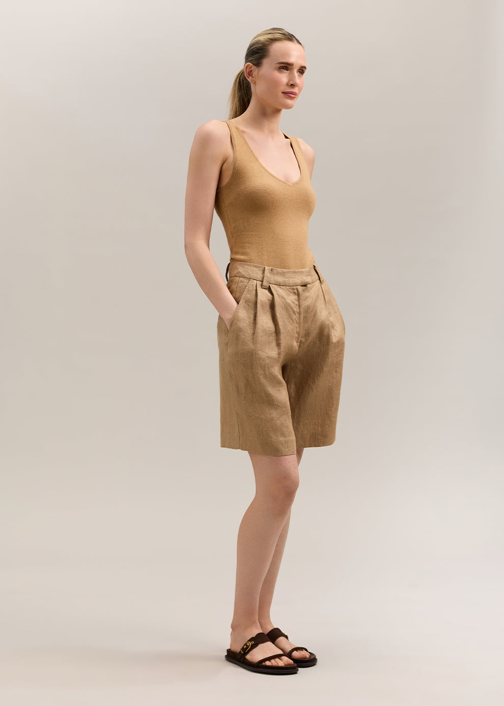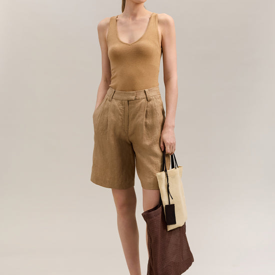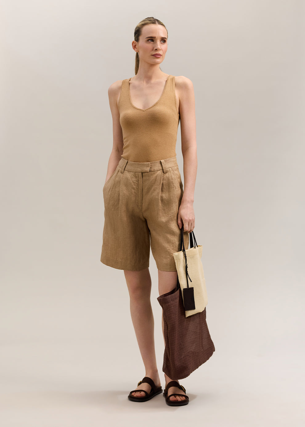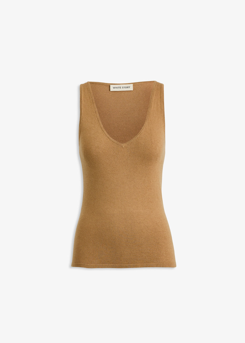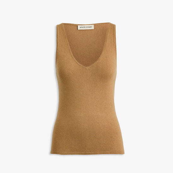The Elena Tank is a slim-fitting essential crafted from a luxurious silk-cashmere blend. Featuring a soft V-neckline and ribbed detailing, it’s perfect for summer layering and effortless styling.