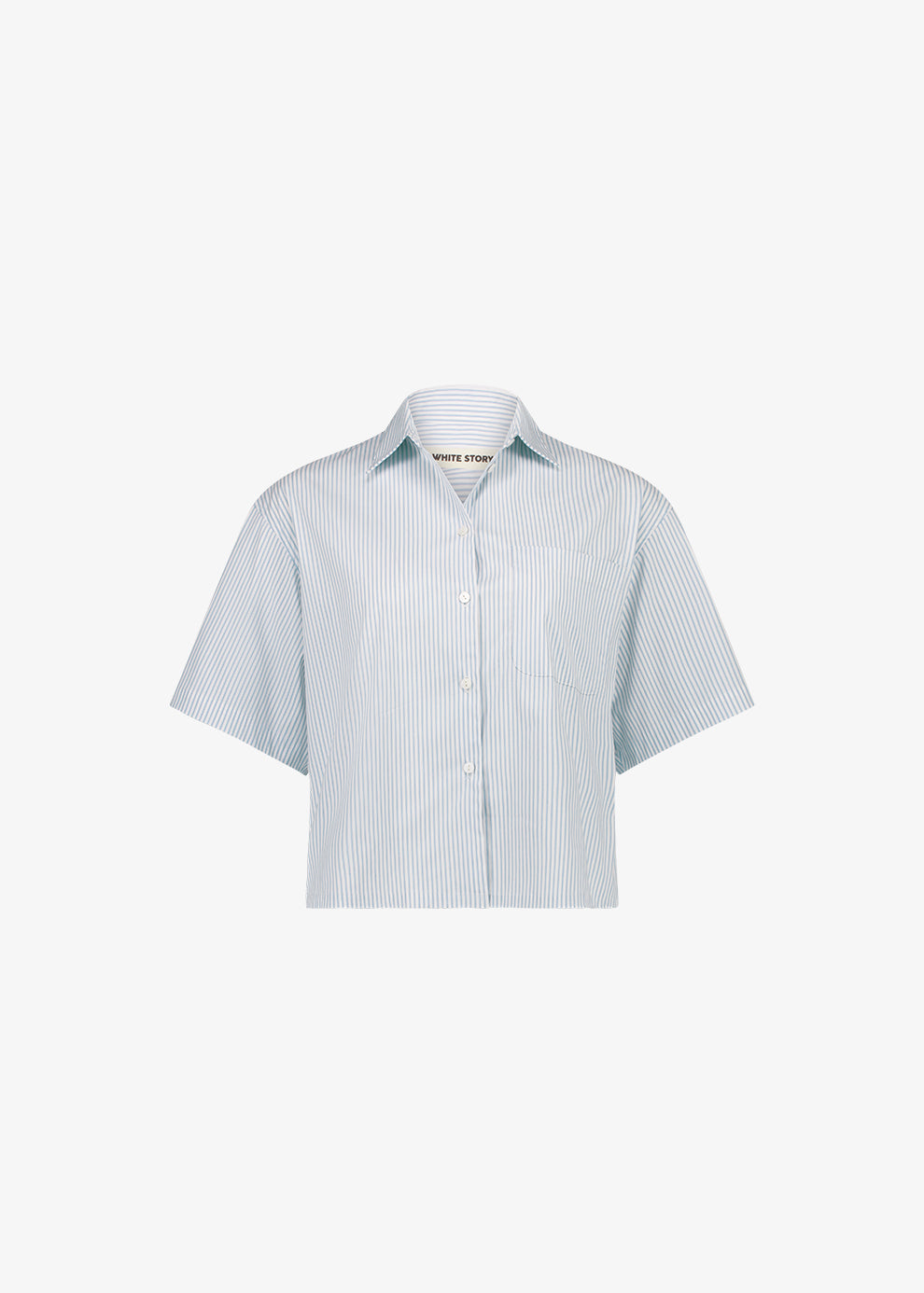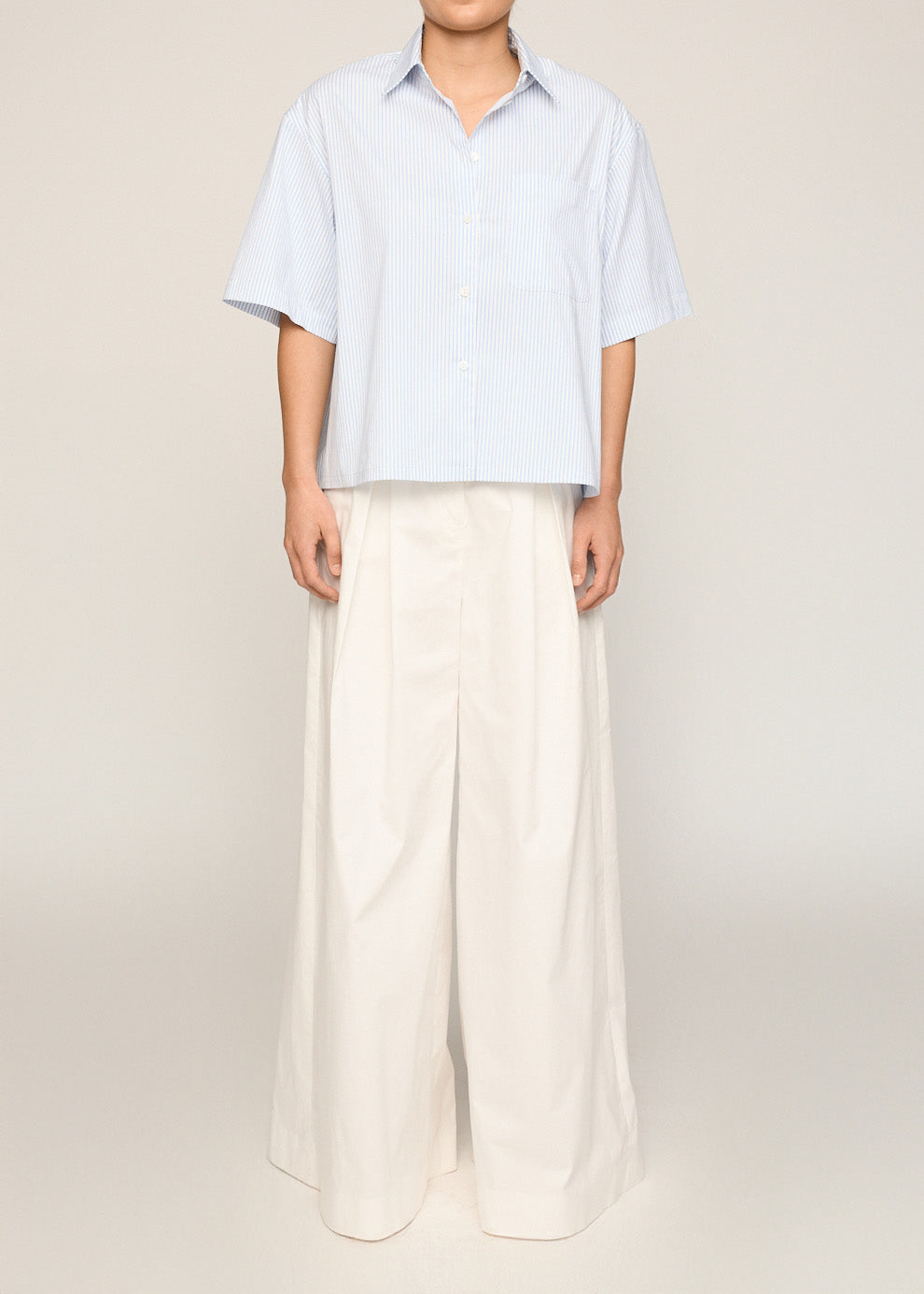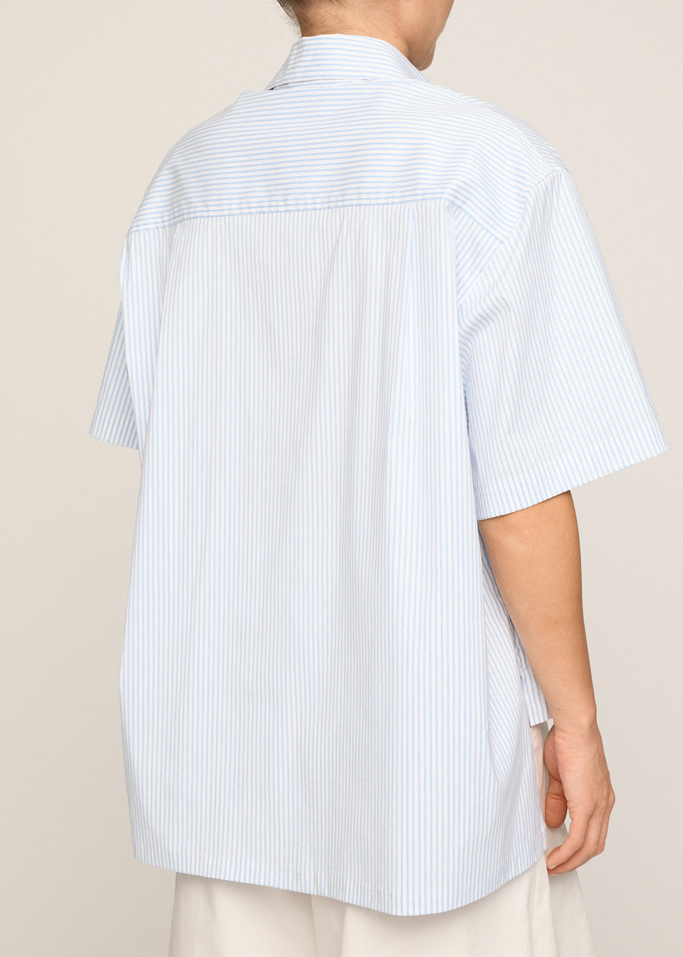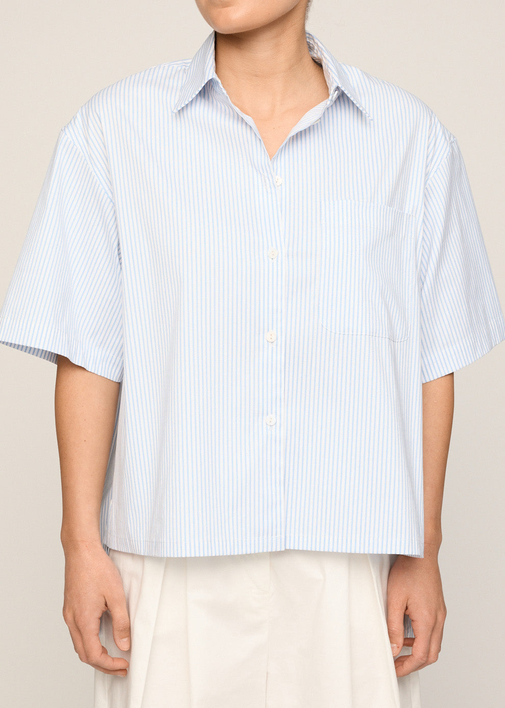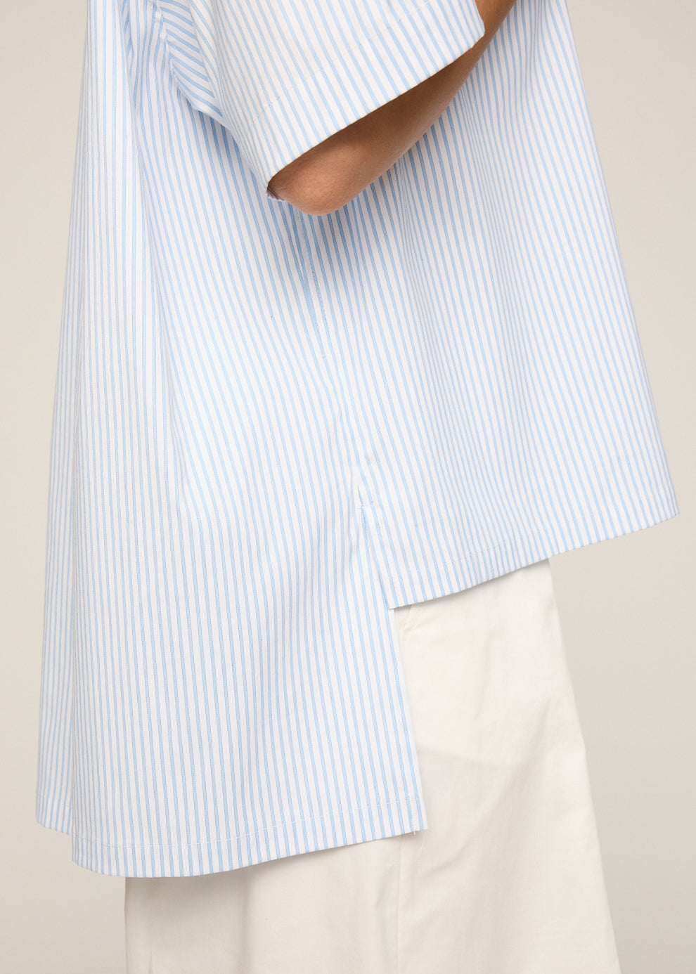 The Elena Shirt is crafted in a soft blue stripe and features a boxy fit, stepped hem, and short sleeves. Its relaxed shape and lightweight feel make it a versatile staple for everyday wear.