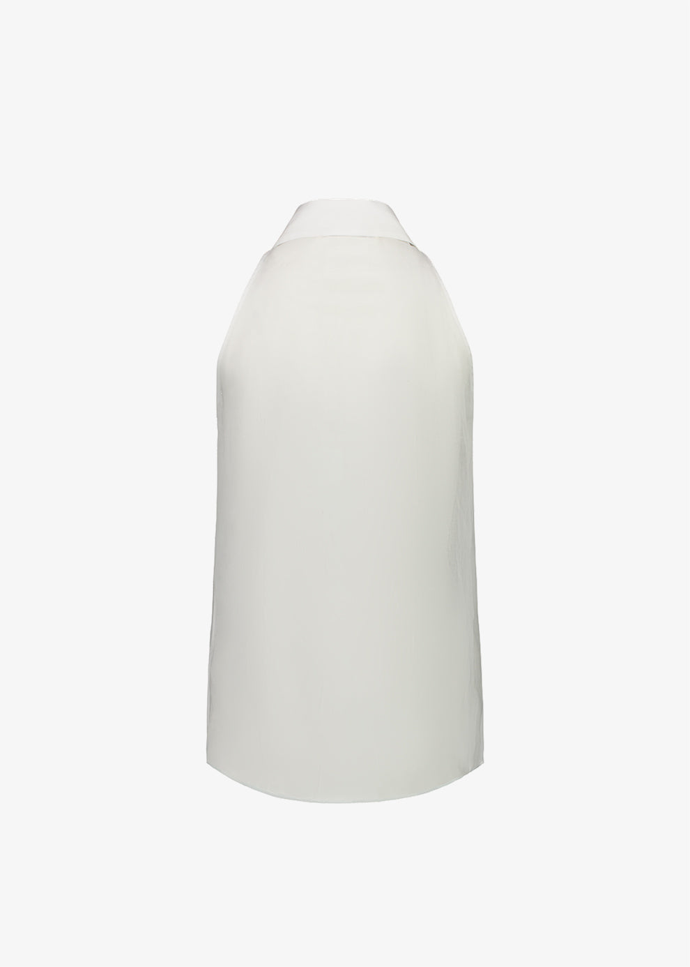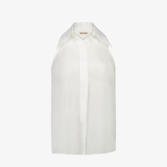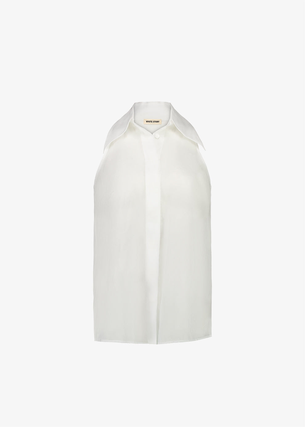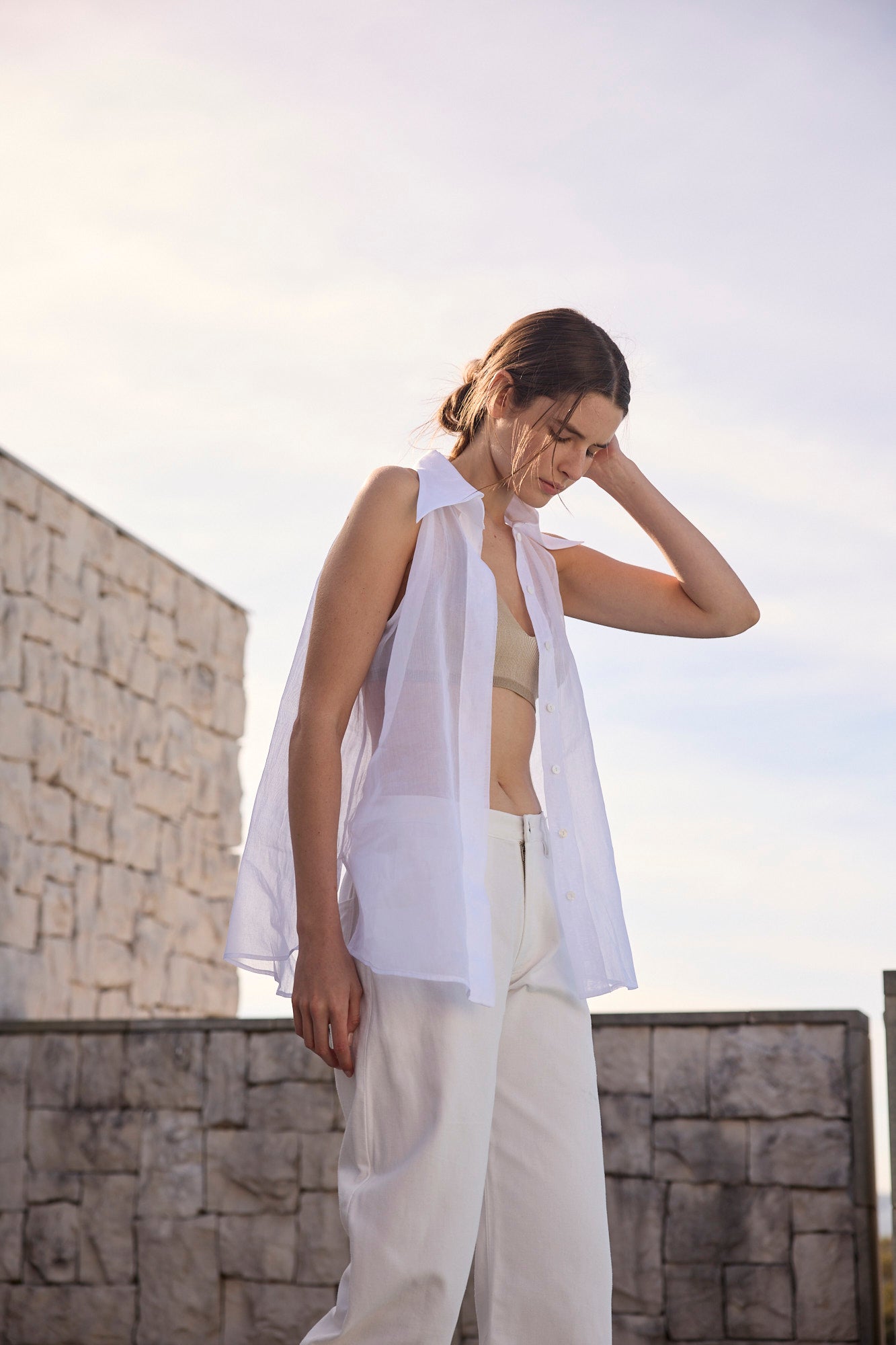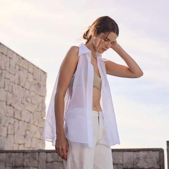 The Ezio Shirt is inspired by a piece our Creative Director borrowed from a friend's wardrobe, which quickly became one of her summer staples. Crafted from a Dutch cotton organza and available in navy and white colourways, this shirt will become a must for your Summer wardrobe as well. Featuring a sleeveless halter neck with a pointed collar and A-line fit, this thoughtfully designed piece will get you through the hottest days of Summer.