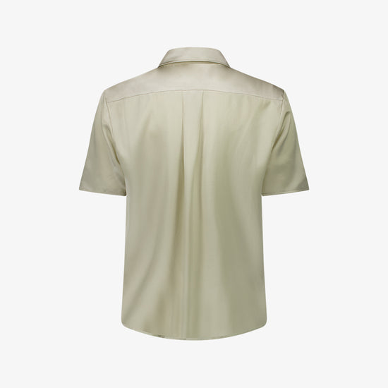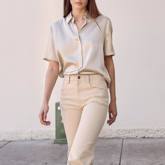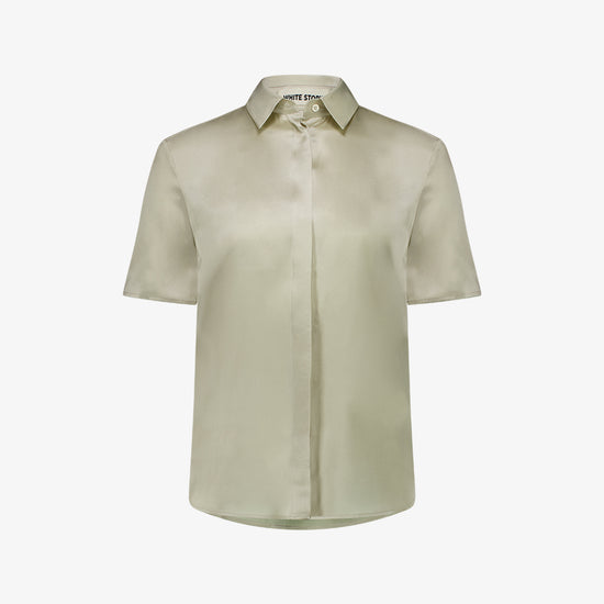 Our best selling Fifi shirt modernised and adapted for Summer with a new short sleeve. A classic dinner shirt, fabricated in 100% silk. Designed to fit off the body, details include a standard collar and cuff, concealed front button-up closure at placket and a curved hem. Tuck into a tailored pant for a dinner event, or loosely undone with denim for an everyday look.