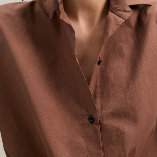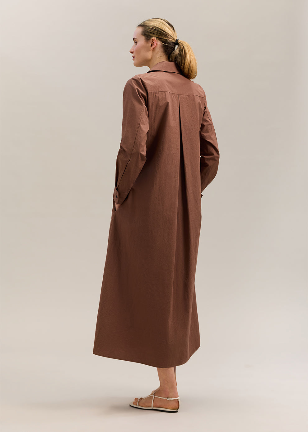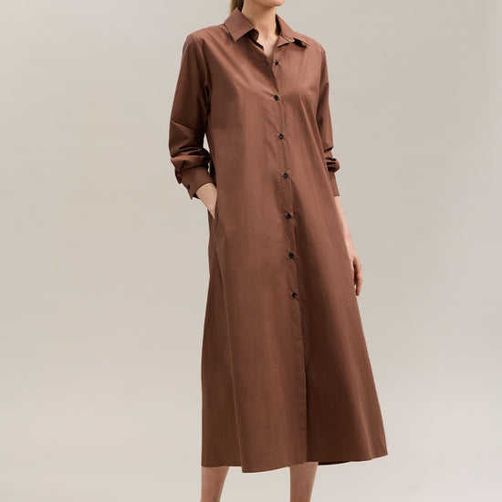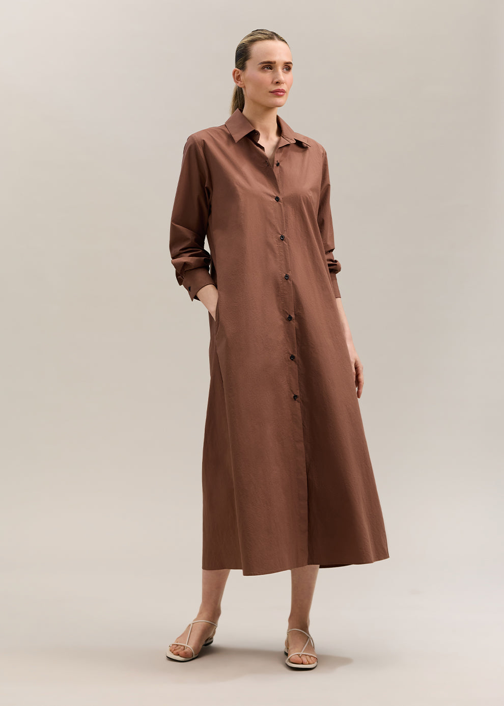 The Francesca Shirt Dress is a maxi-length style with a classic shirting silhouette, cut in a rich chocolate brown for the season. Featuring a relaxed fit with slight waist shaping, long sleeves, and a button-down front, it’s ideal for effortless summer travel.