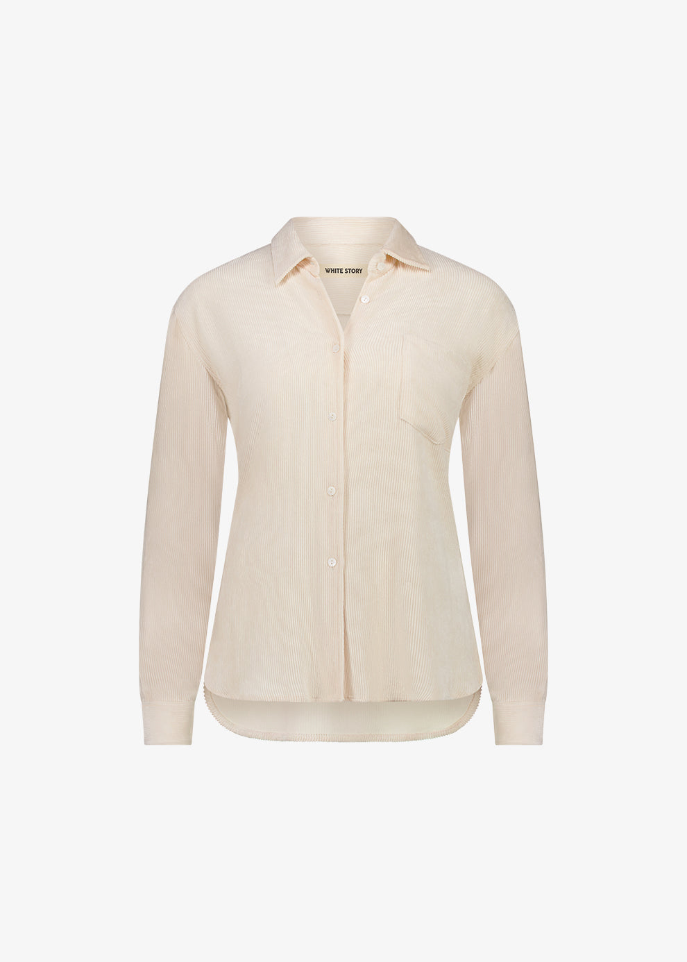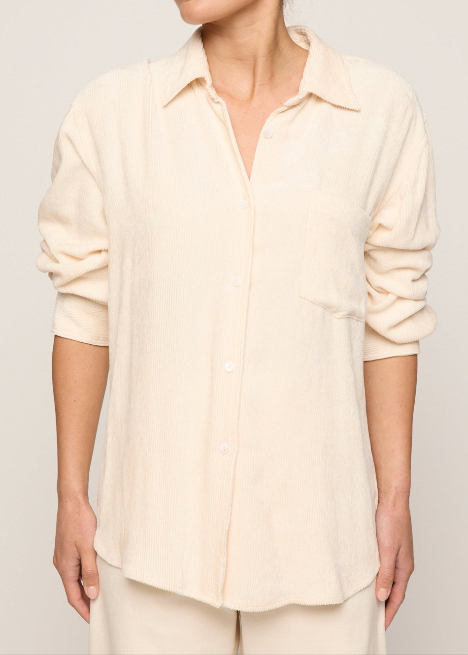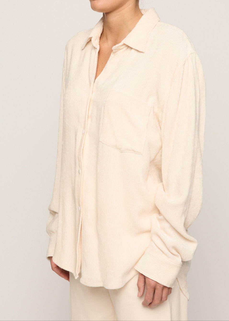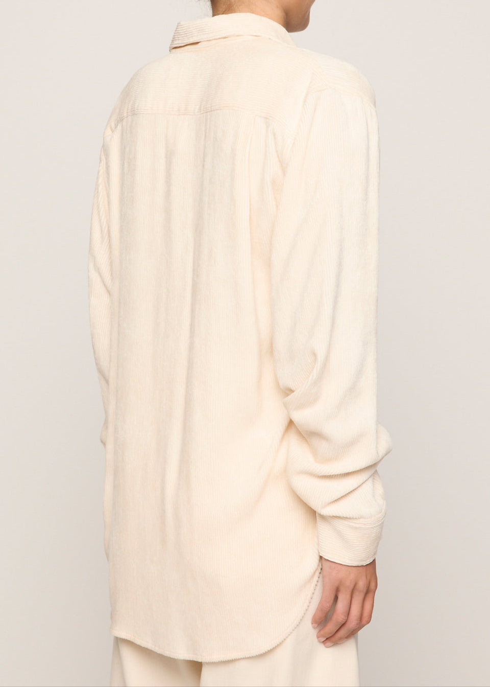The Francesca Shirt is a long sleeve button front shirt featuring front patch pocket at left breast, fabricated in a textured corduroy sourced from Japan. Pair with one of our tonal pants for a casual look.