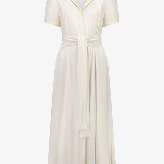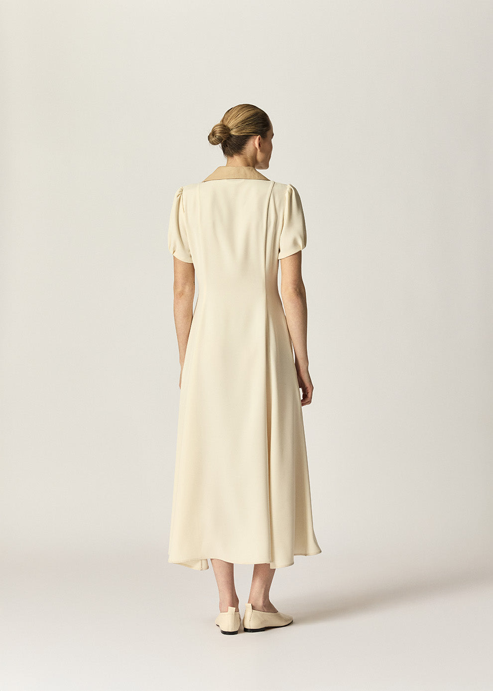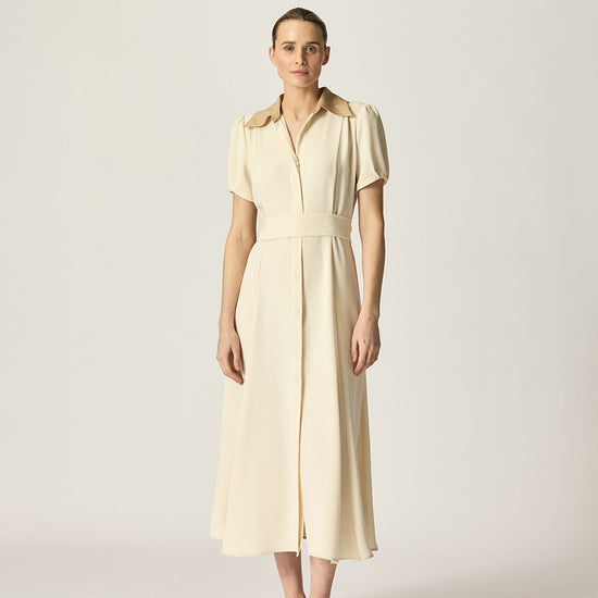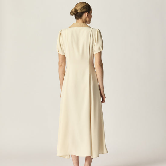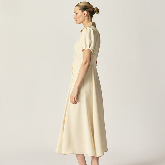 The Franci Dress is a timeless midi style crafted in double cloth satin for an elegant drape. Featuring full-length panelling for subtle shaping, a contrast tan collar in Japanese cotton lawn, and softly puffed sleeves, it balances structure with femininity.