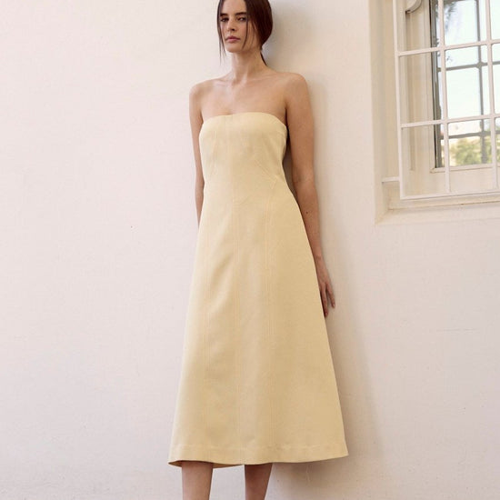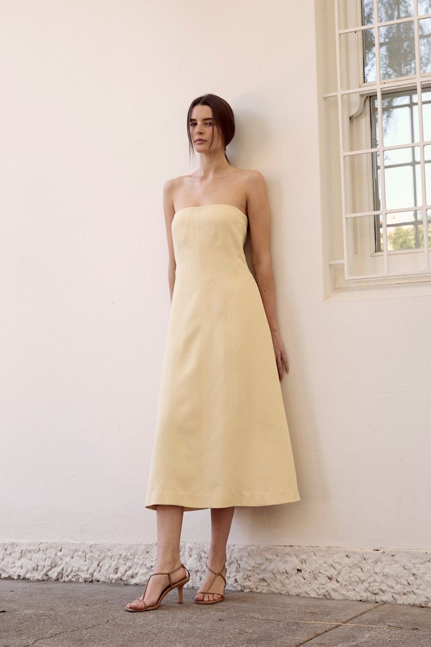 The Freya dress is the pinnacle of detail and sophistication. Crafted in a Japanese boucle style textured fabric and featuring panelling and intricate topstitching detail throughout, a strapless neckline, and a flattering A-line skirt, this dress will charm for all your Summer events.