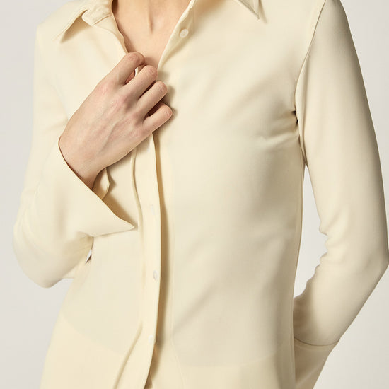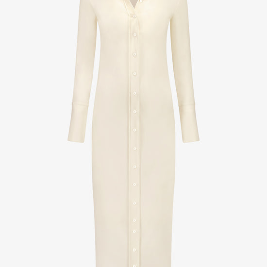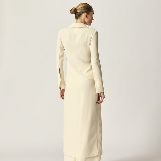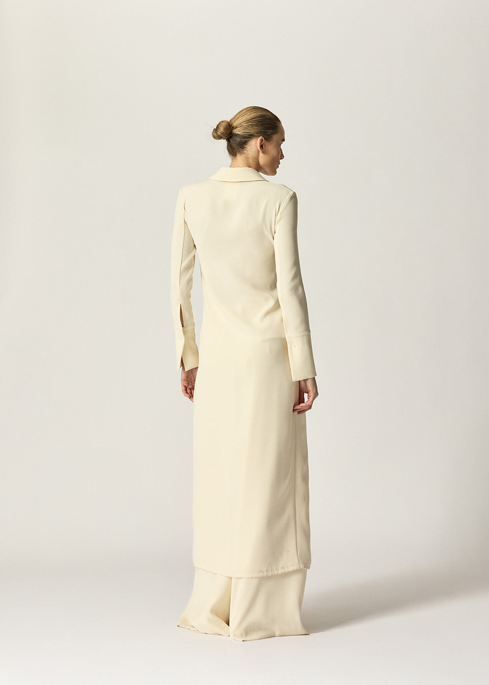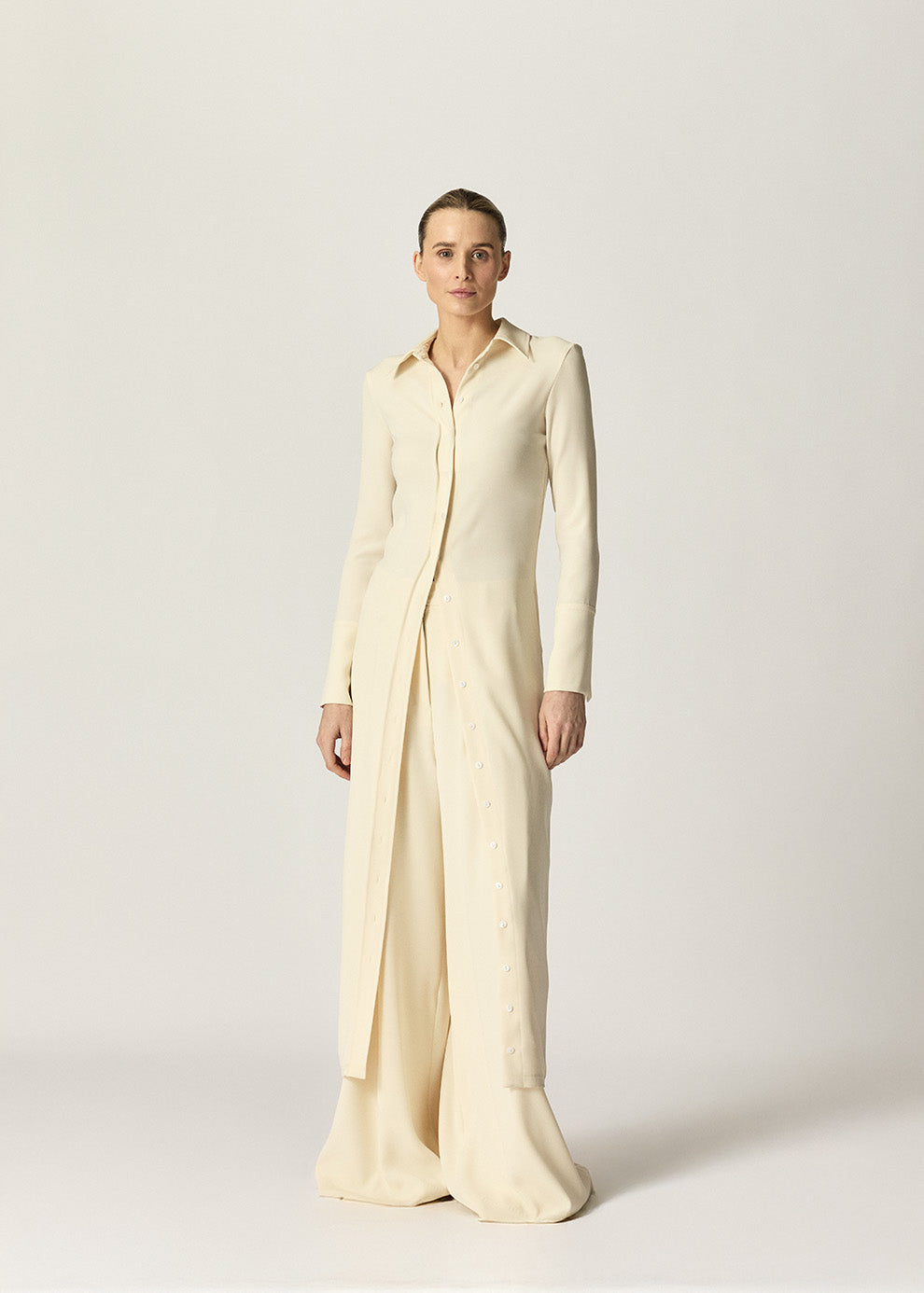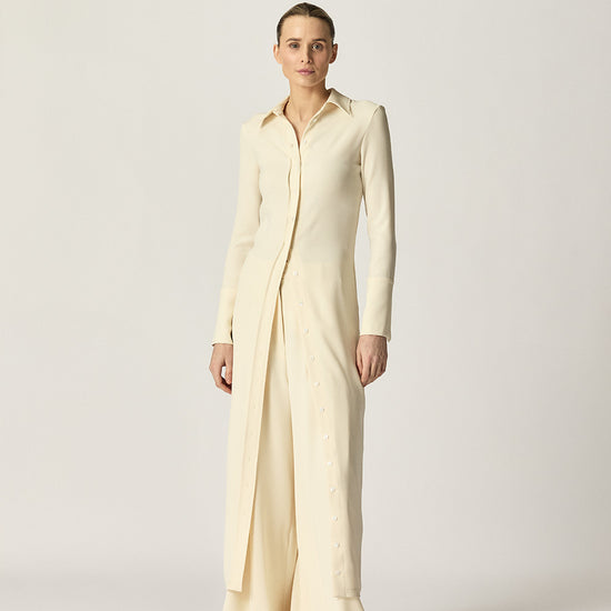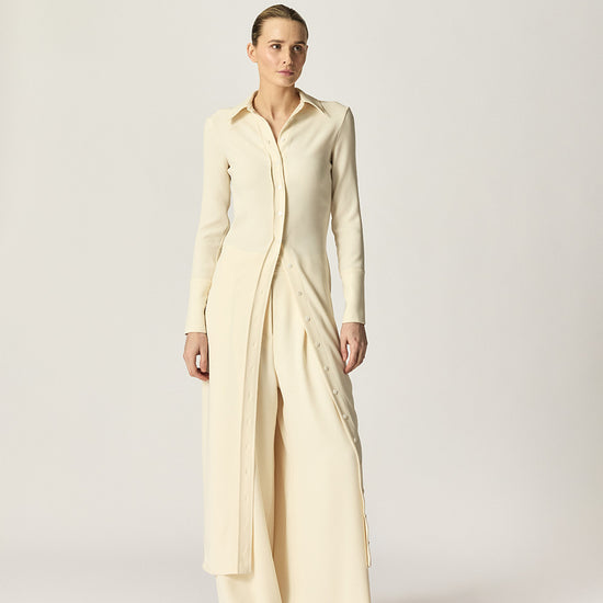 The Gabriella Dress is a maxi-length style crafted from double cloth satin, designed to drape effortlessly. Featuring a front button closure, classic collar, and wide statement cuffs, it can be worn as a dress or open as a full-length cardigan.