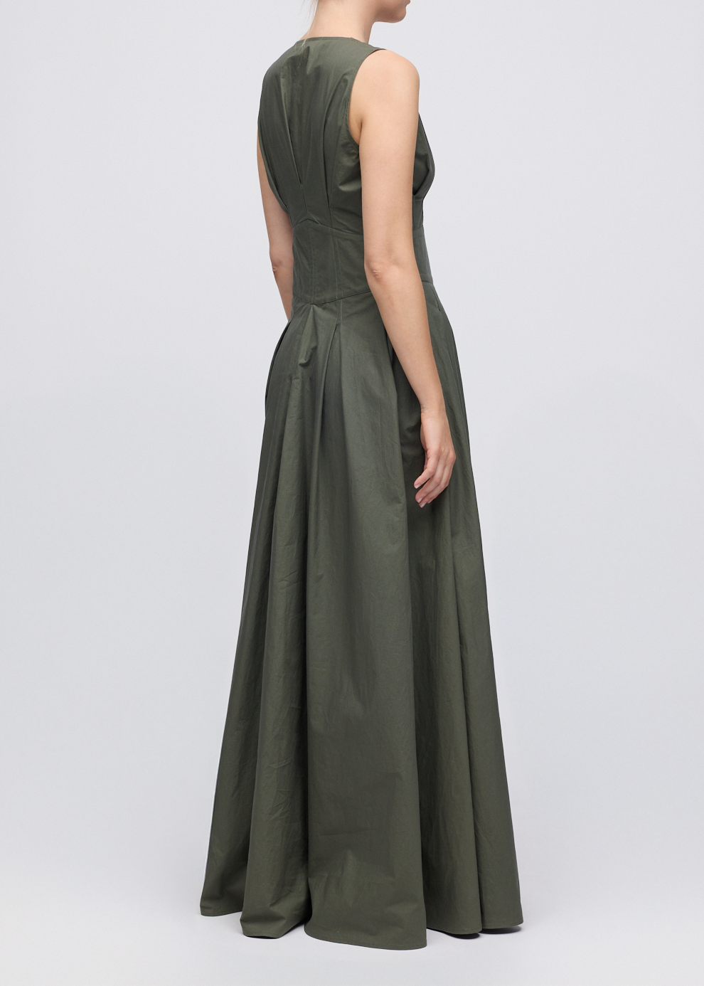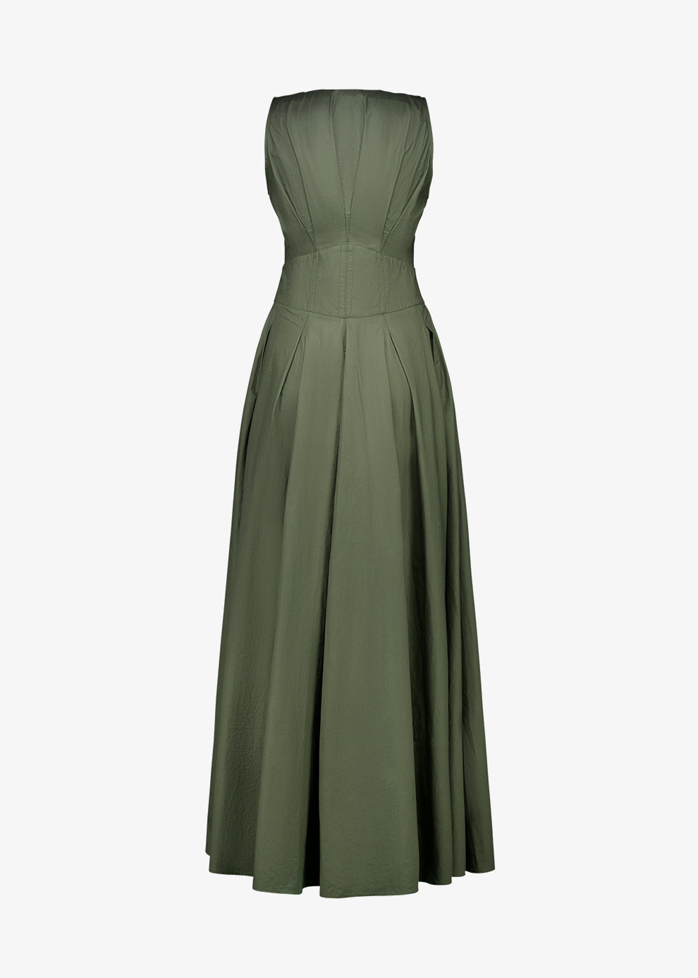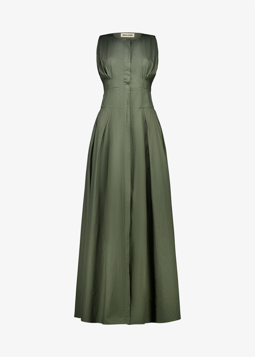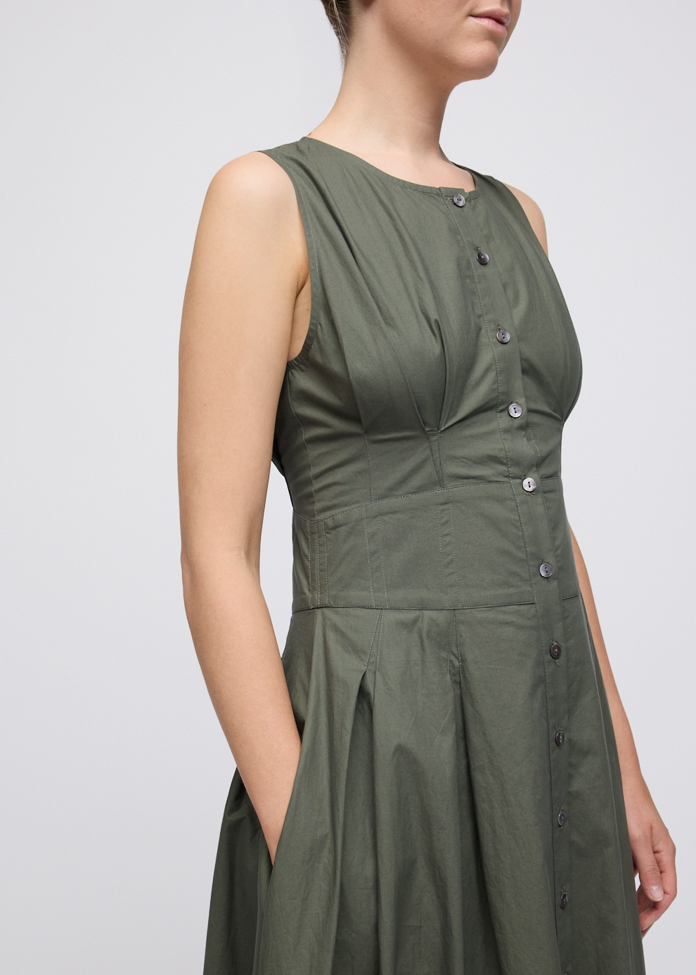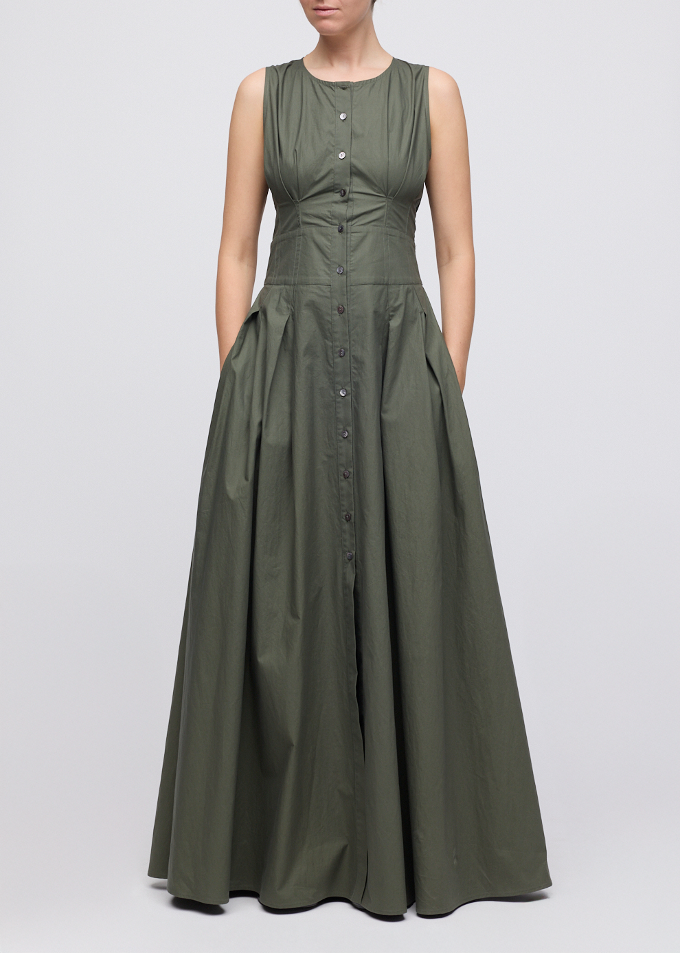 A revival of an archival White Story piece reimagined in pure cotton. Featuring a centre front button closure, and pleating at the bust and waist to create a nipped in effect, the Grecian dress is a refined, easy to wear summer staple. Throw our khaki crew neck cashmere knit over your shoulders for an added layer on cooler days.