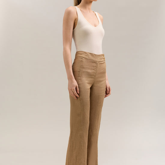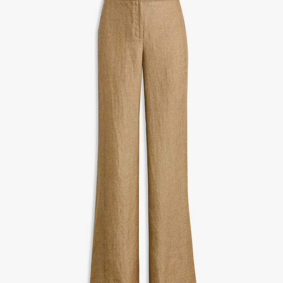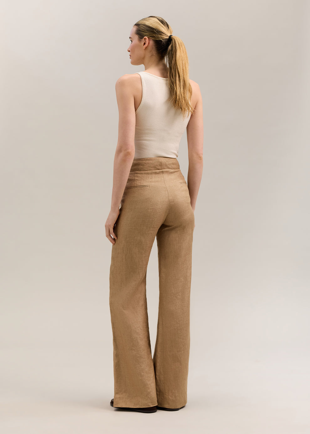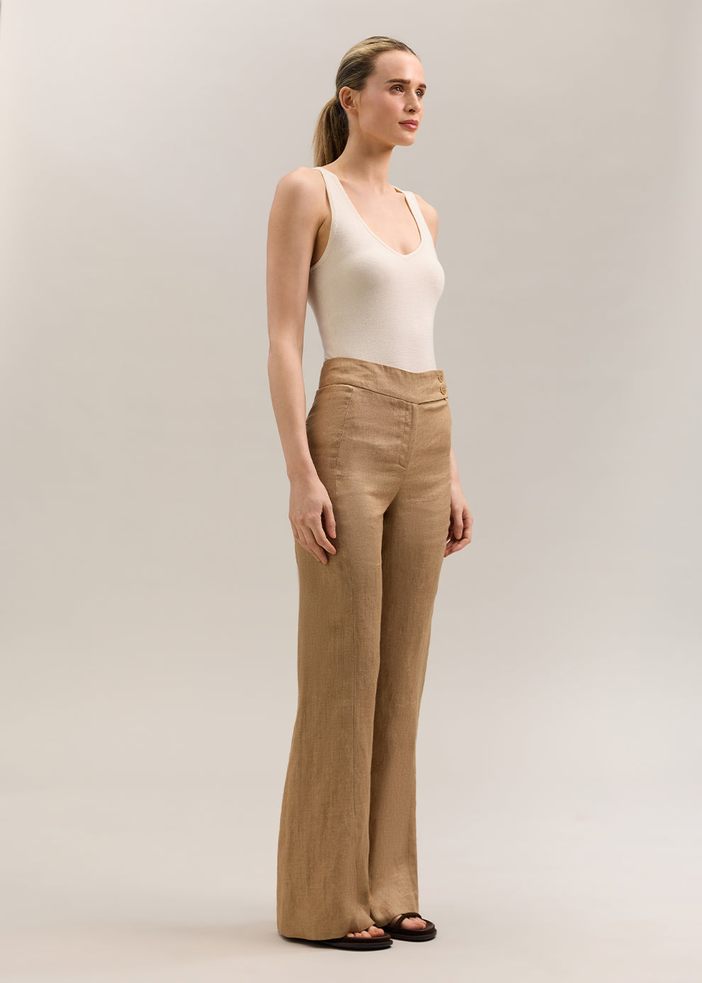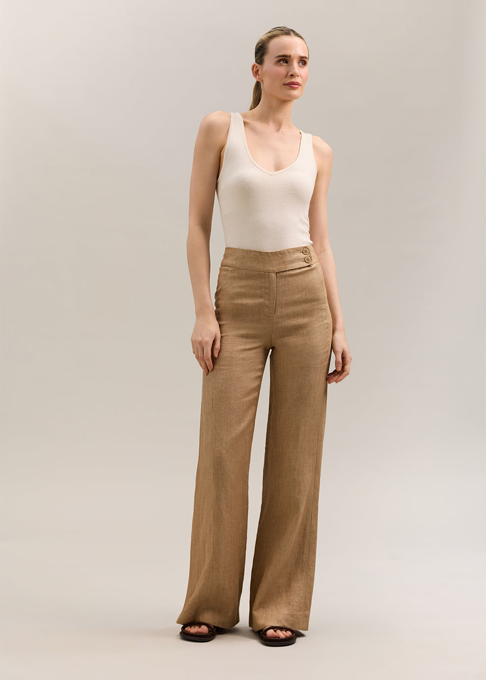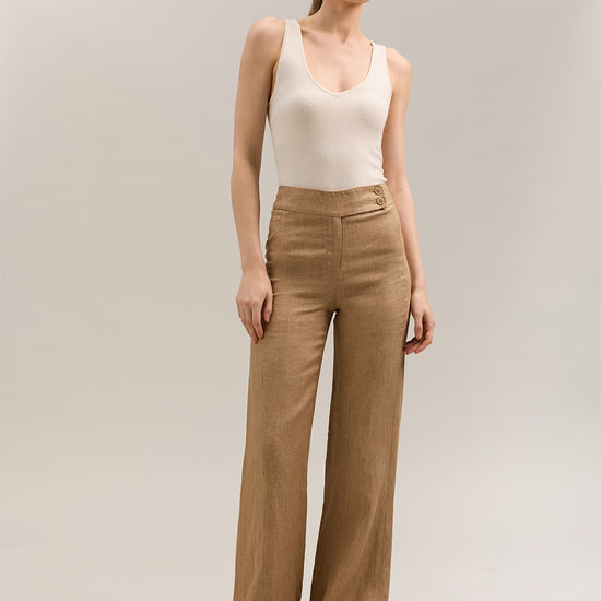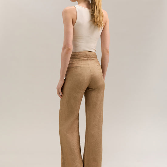 The James Pant is a high-waisted style crafted from luxurious Italian linen in a rich chestnut tone. Featuring a wide-leg silhouette, wrap button waistband, and front fly zipper, it offers ease and elegance for warm-weather dressing.