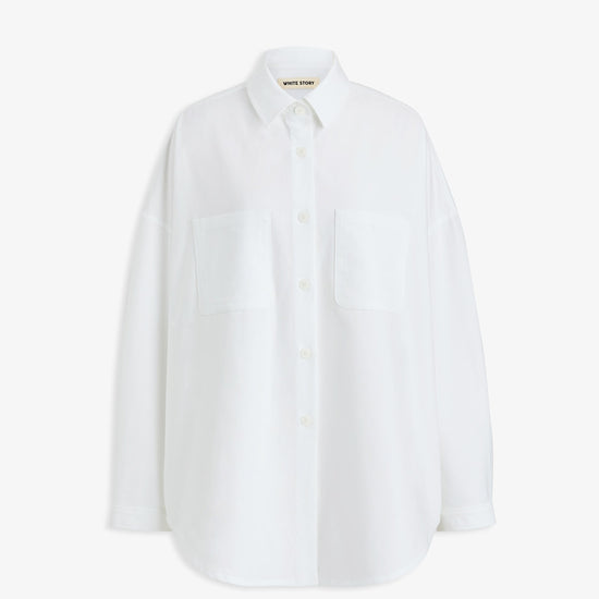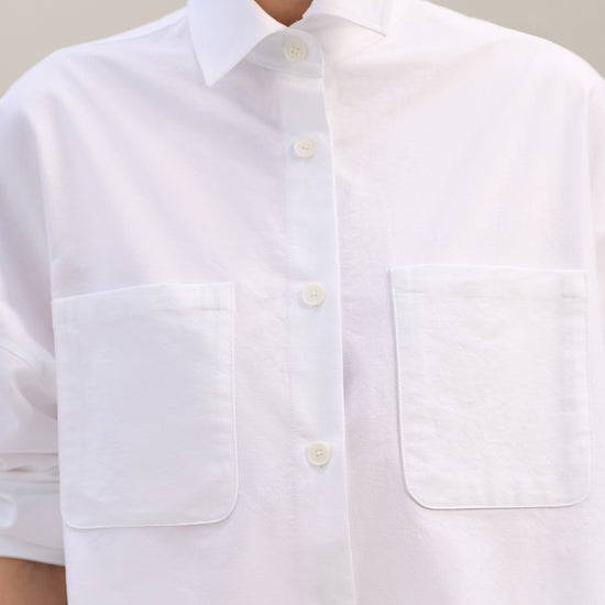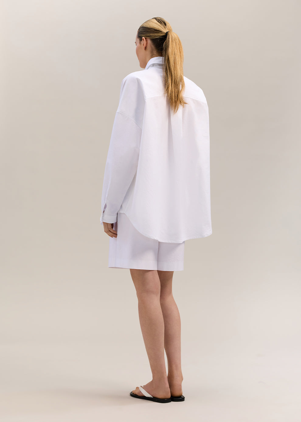 The Kasi Shirt is a crisp summer essential cut from 100% Italian cotton oxford in white. Designed with an oversized boxy fit, pointed collar, front patch pocket, and button-down front, it’s perfect for beach days, travel, and warm evenings.