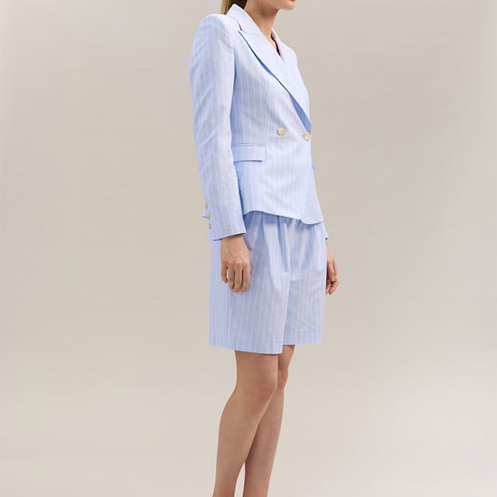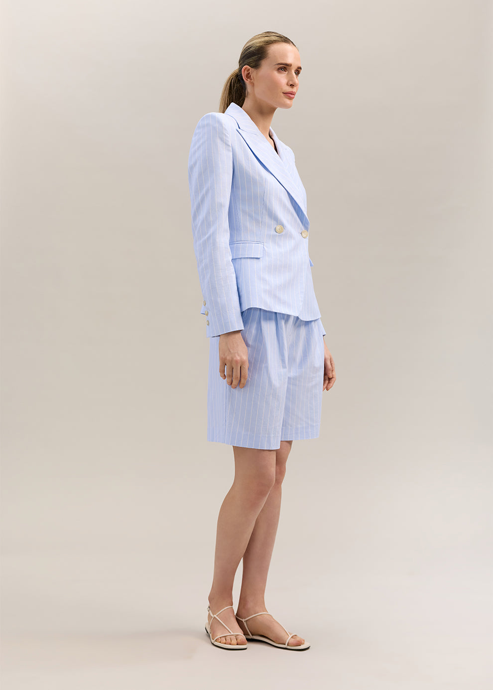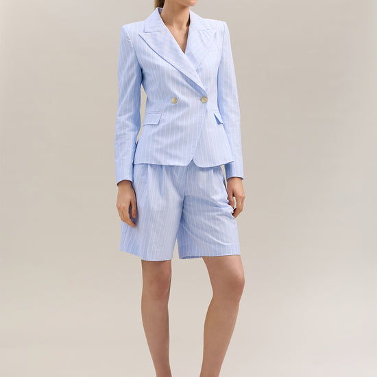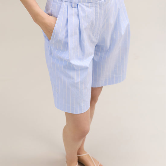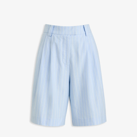 The Long Fez Short is a tailored longline short crafted from crisp cotton oxford. Designed with pleating, cutaway side pockets, and a mid to high-rise waist, it finishes just above the knee for a flattering, structured summer look.