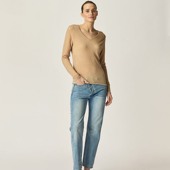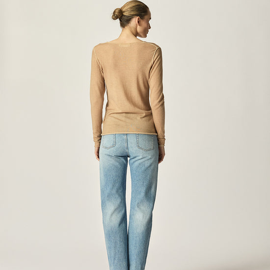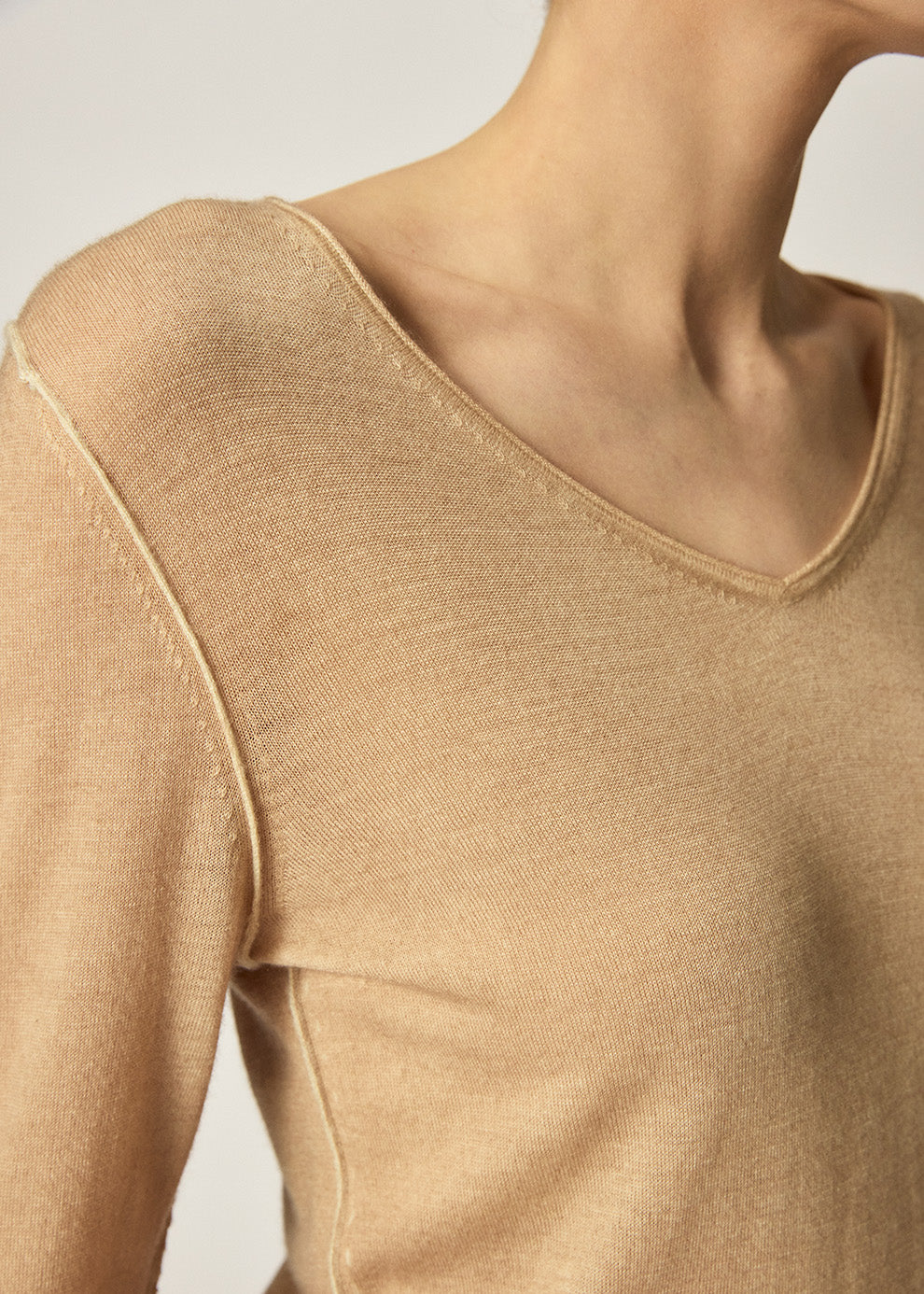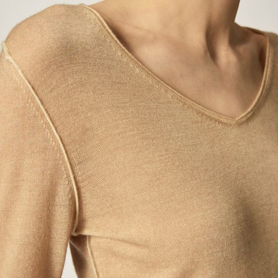 The Lucia Knit is a lightweight 100% cashmere top with a flattering V-neckline, external seams, and roll-edge finishes. Individually spray-dyed for a one-of-a-kind look, it’s a refined staple with subtle detailing.