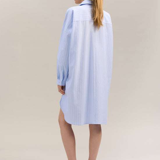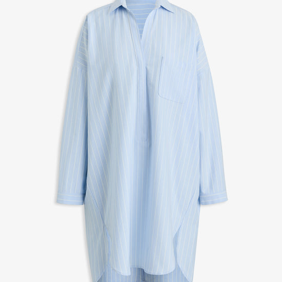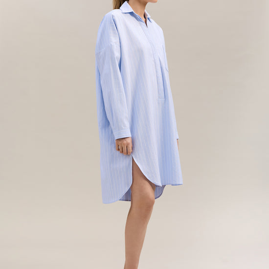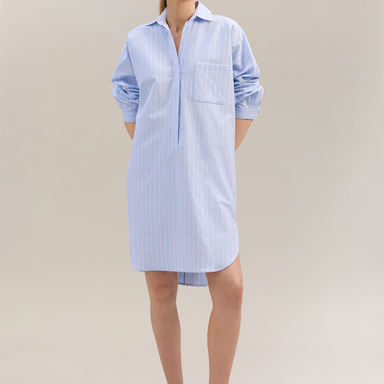 The Maya Shirt Dress is crafted from breathable 100% cotton oxford in a fresh sky blue and white stripe. Featuring a boxy fit, half placket button front, shaped side seams, and a pointed collar, it’s the perfect throw-on piece for summer travel and warm-weather days.