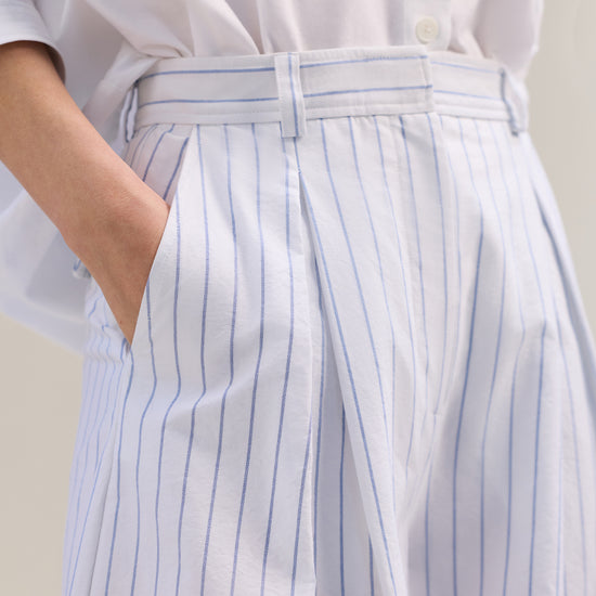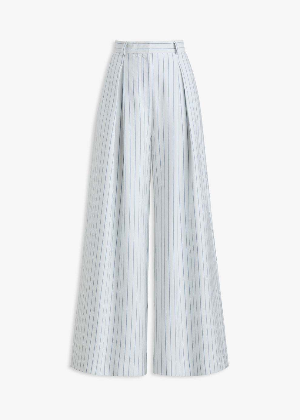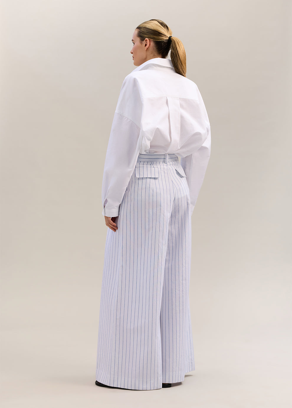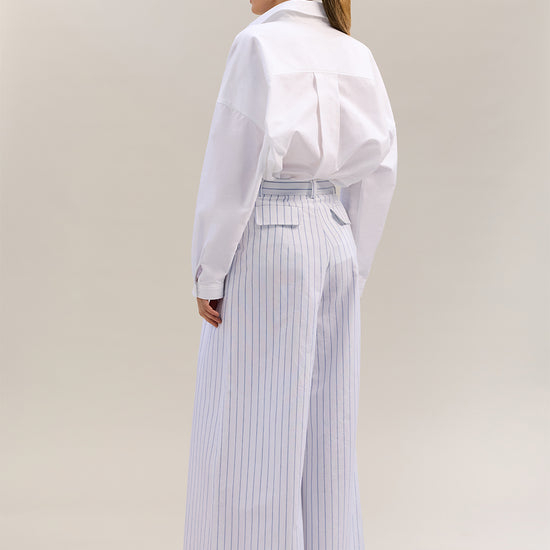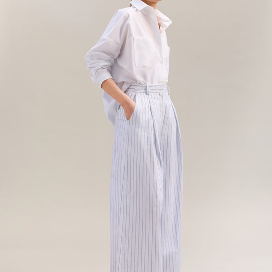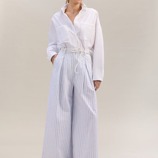 The Murano Pant is a wide-leg palazzo style crafted from sleek white and navy Italian cotton oxford that epitomises feminine tailored suiting. Designed to sit high at the waist, it features pleating, belt loops, and cutaway pockets for a structured yet effortless fit.