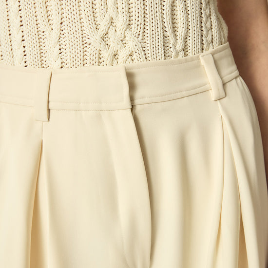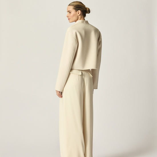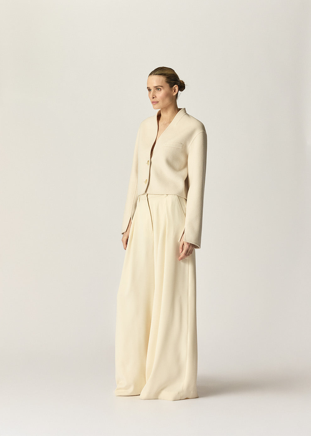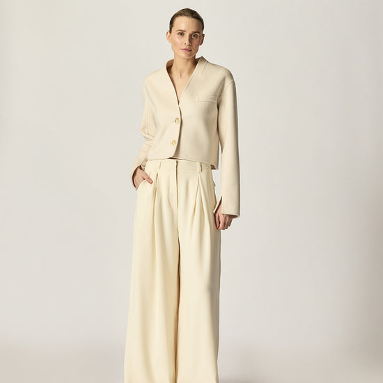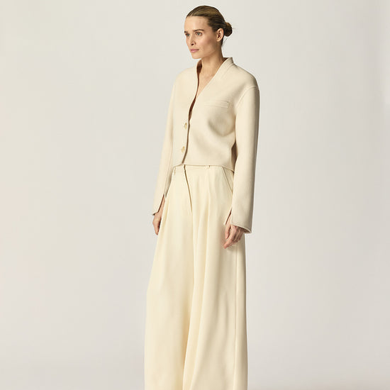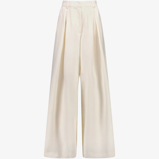 The Murano Pant is a high-waisted, wide-leg palazzo style crafted from double cloth satin for elegant drape and movement. With pleating, cutaway pockets, and a soft cream hue, it’s a refined staple for elevated dressing.