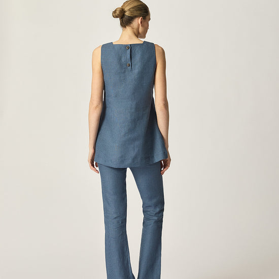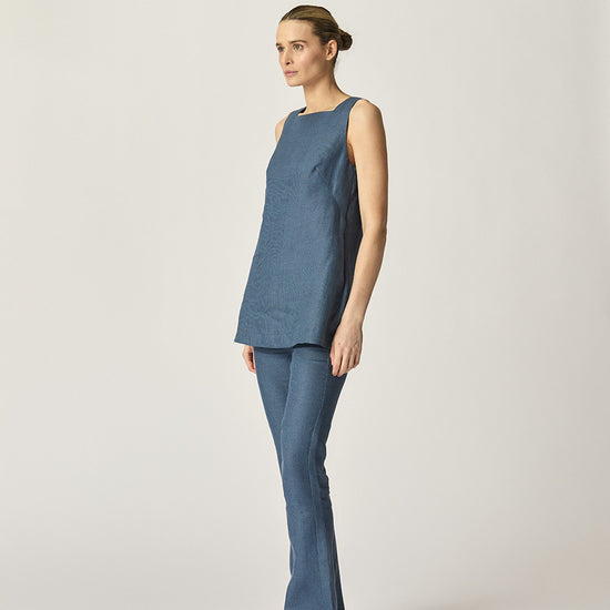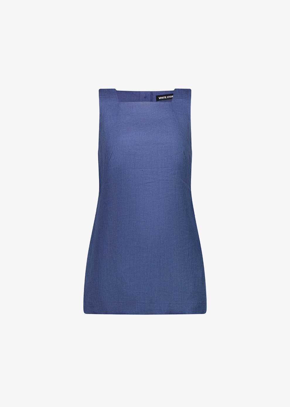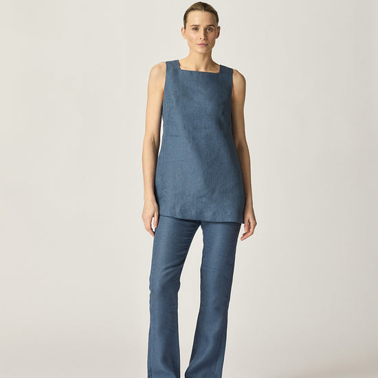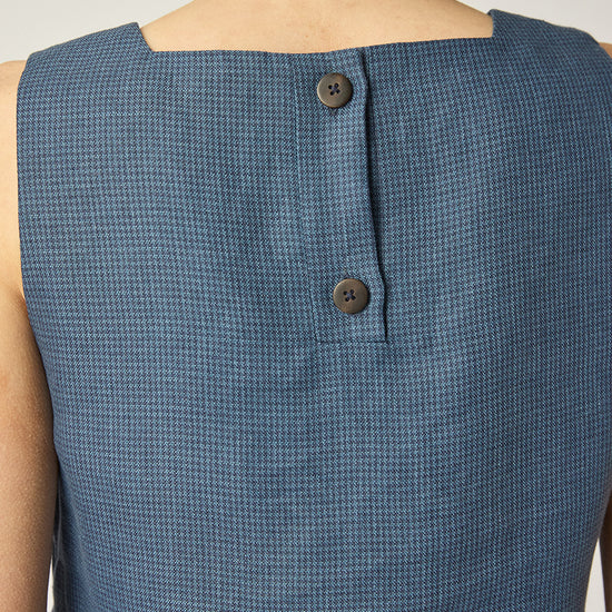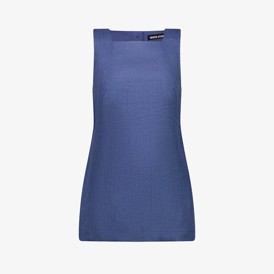 The Nova Tunic is a modern shift-style top cut from premium Portuguese linen in a blue houndstooth print. Featuring a square neckline, wide straps, bust darts, and a slight flare at the hip, it’s finished with a keyhole back and button closure.