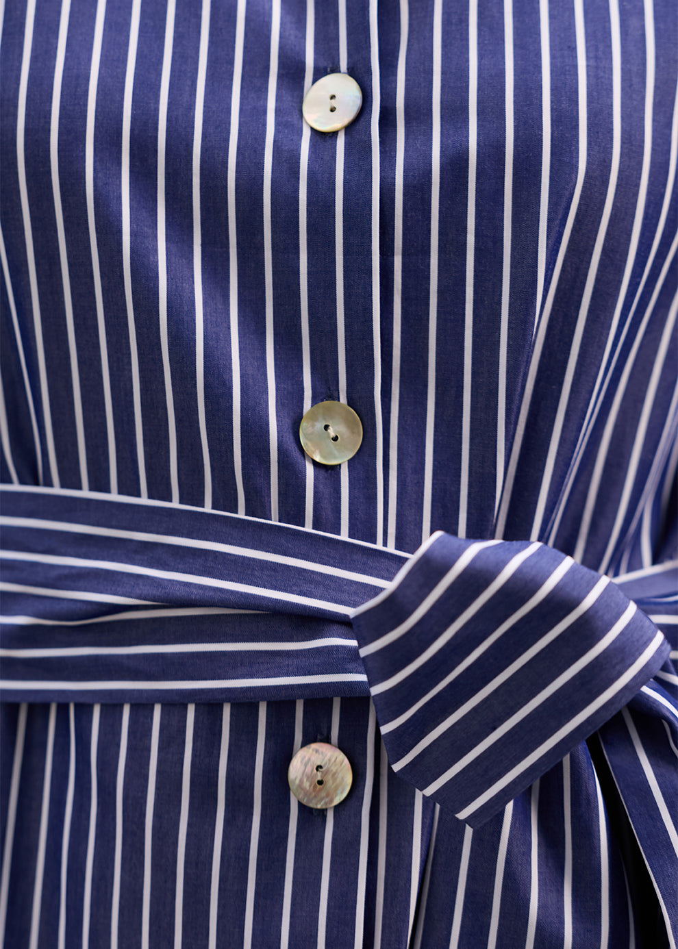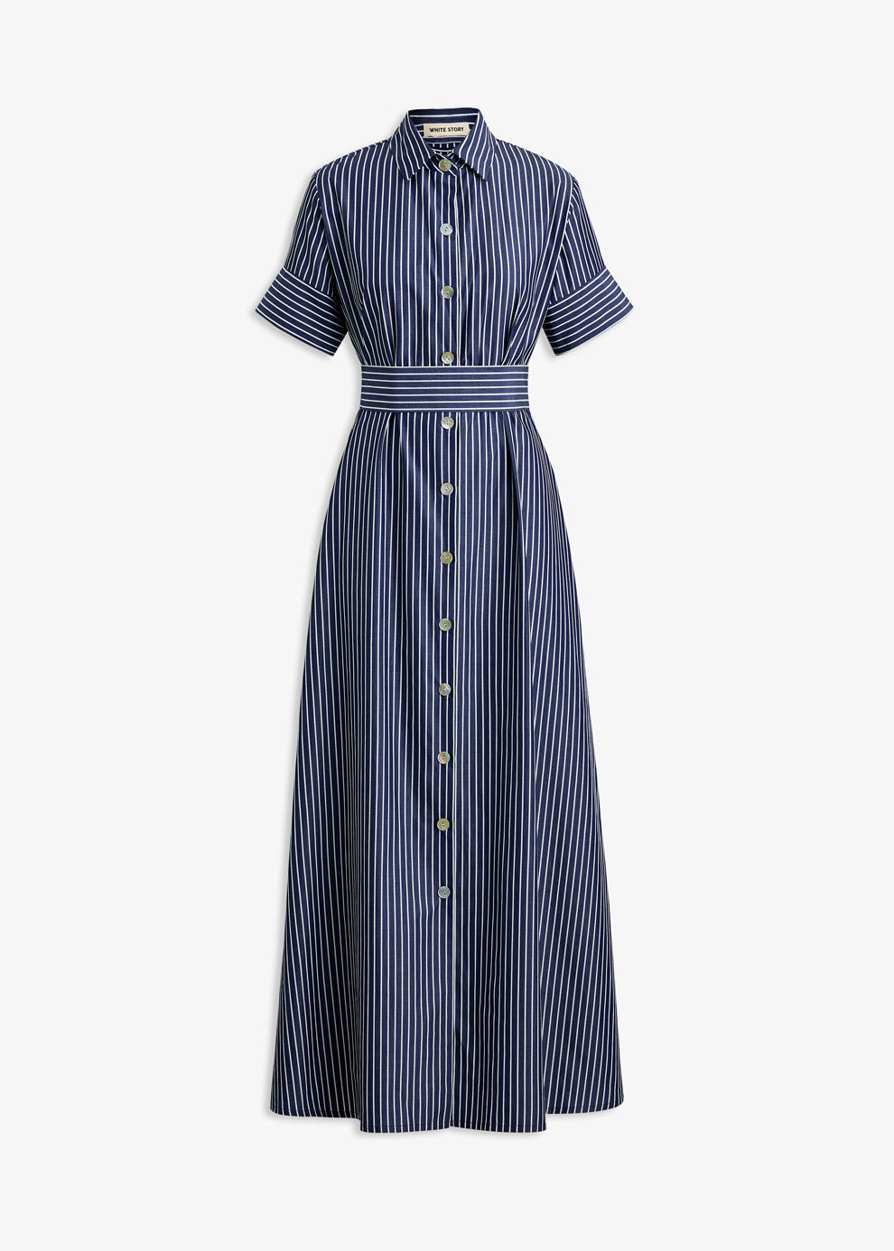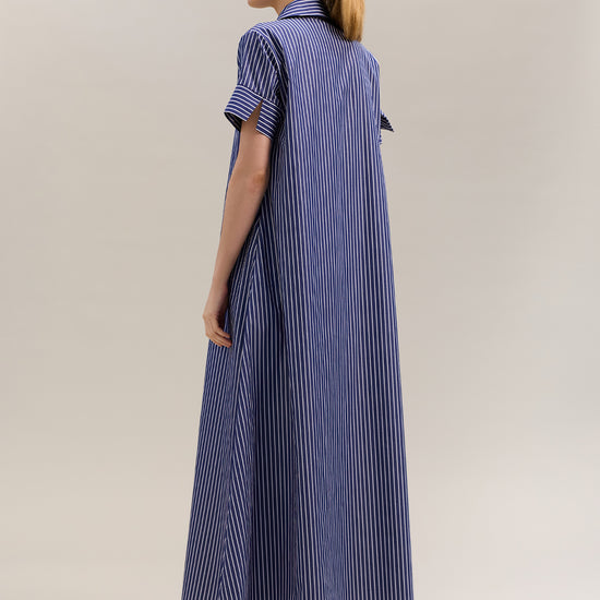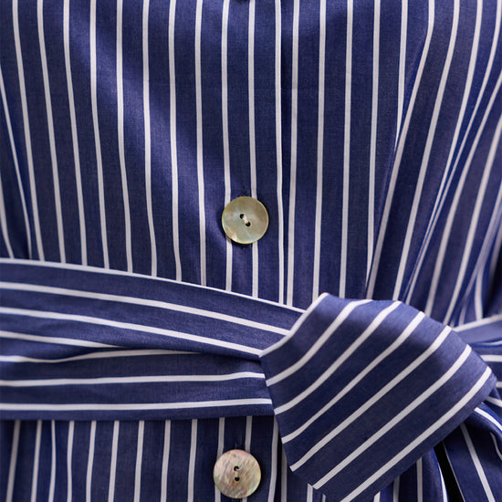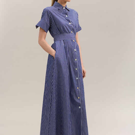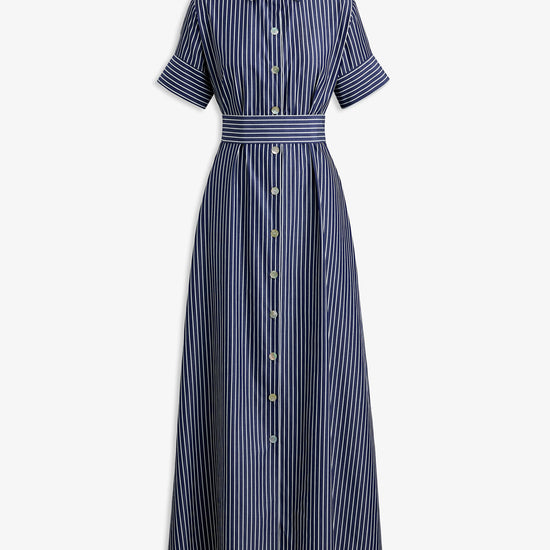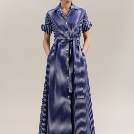 The Sirena Dress is a shirt-style maxi crafted from breathable 100% cotton in an indigo and white stripe. Featuring a mandarin collar, cuffed short sleeves, button-down front, and matching waist tie, it offers a flattering and effortless silhouette.