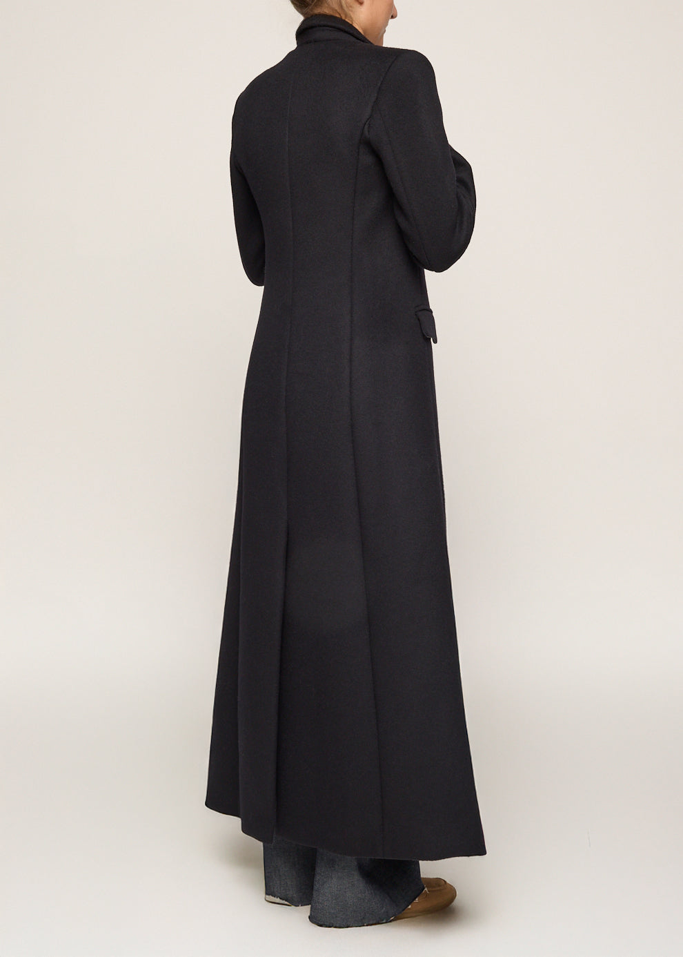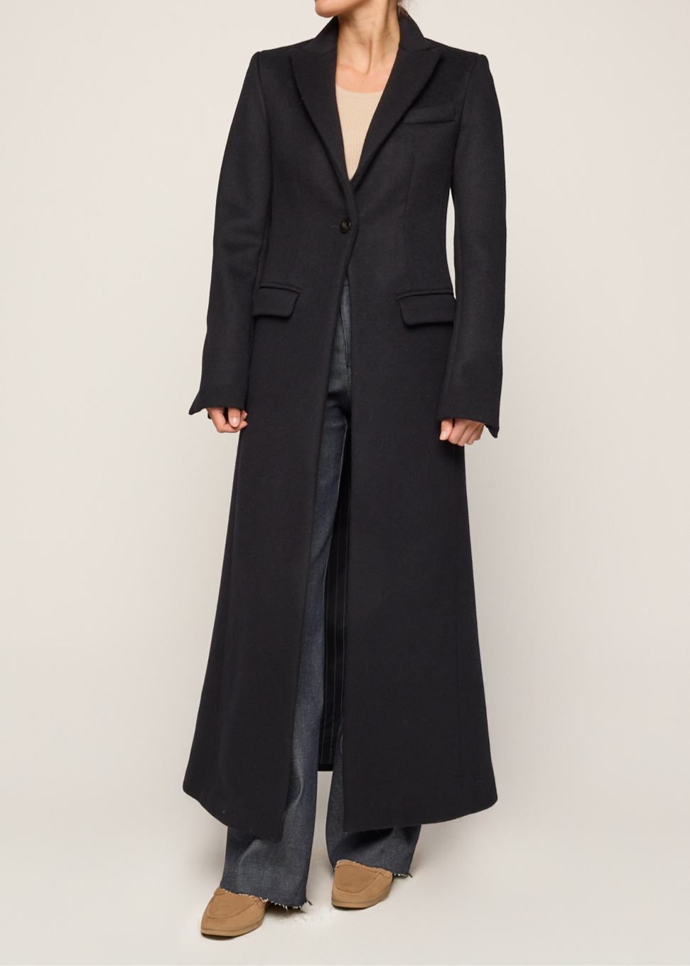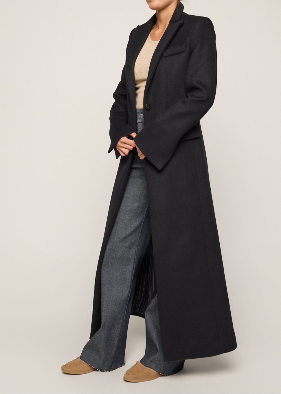 Our signature Venetian Maxi Coat is revisited in a navy 100% wool fabrication. Featuring peaked lapels, a back vent, structured shoulders, and a single-breasted button closure, this timeless full-length piece will be a wardrobe staple for years. Limited sizes available.