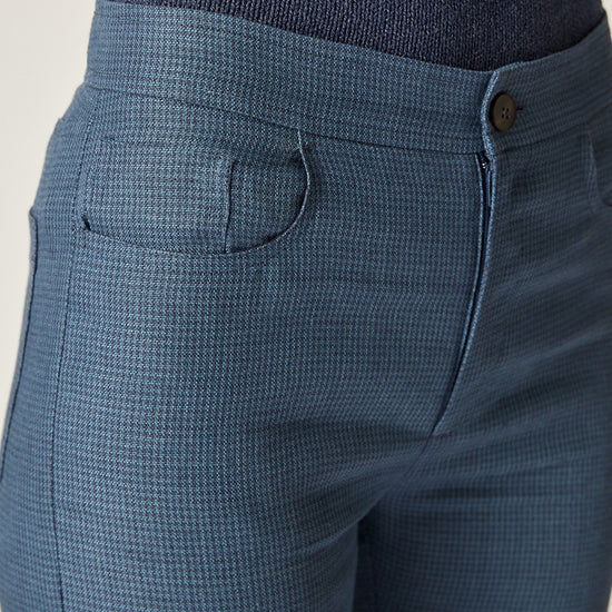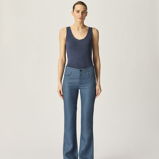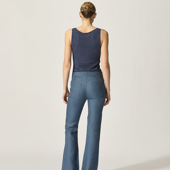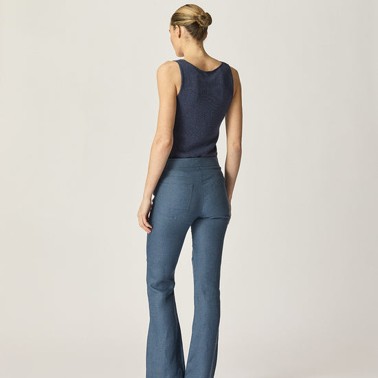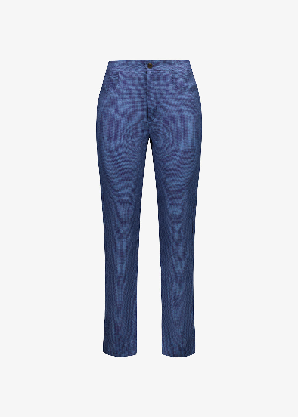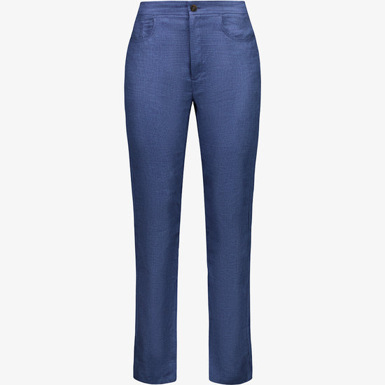 The Vivian Pant is a flattering bootcut style, fitted through the waist, hip, and knee before flaring at the hem to elongate the leg. Crafted from premium Portuguese linen in a bold blue houndstooth, it brings a fresh edge to tailored dressing.